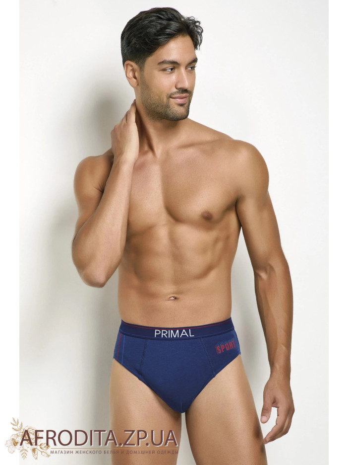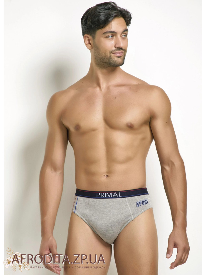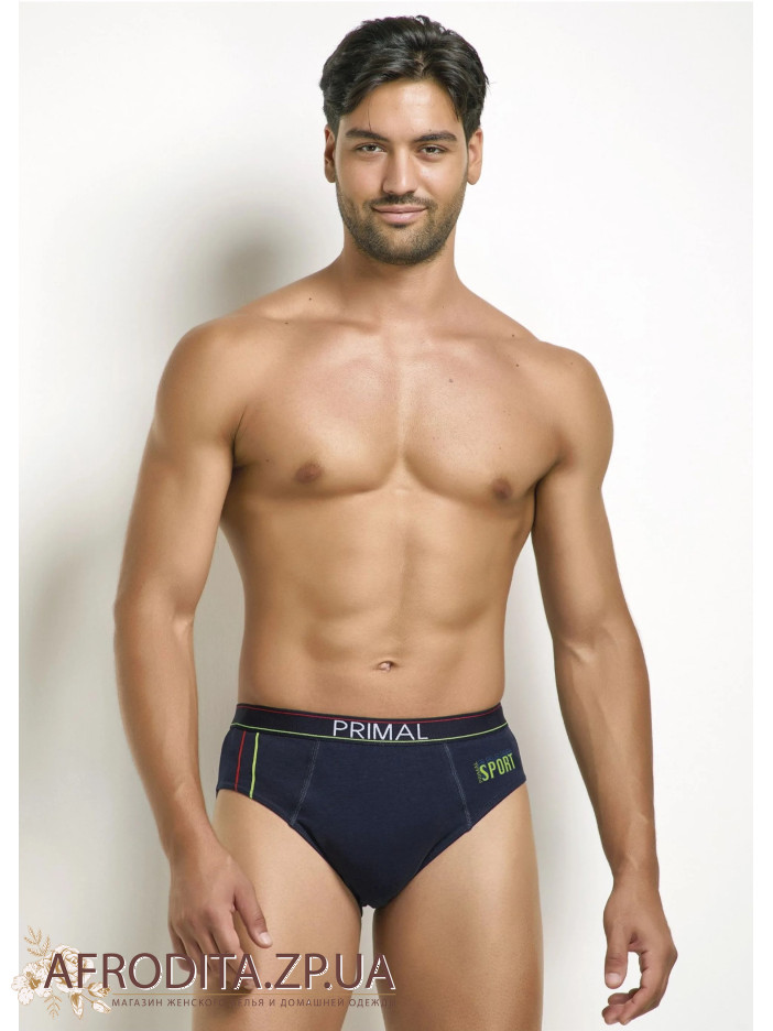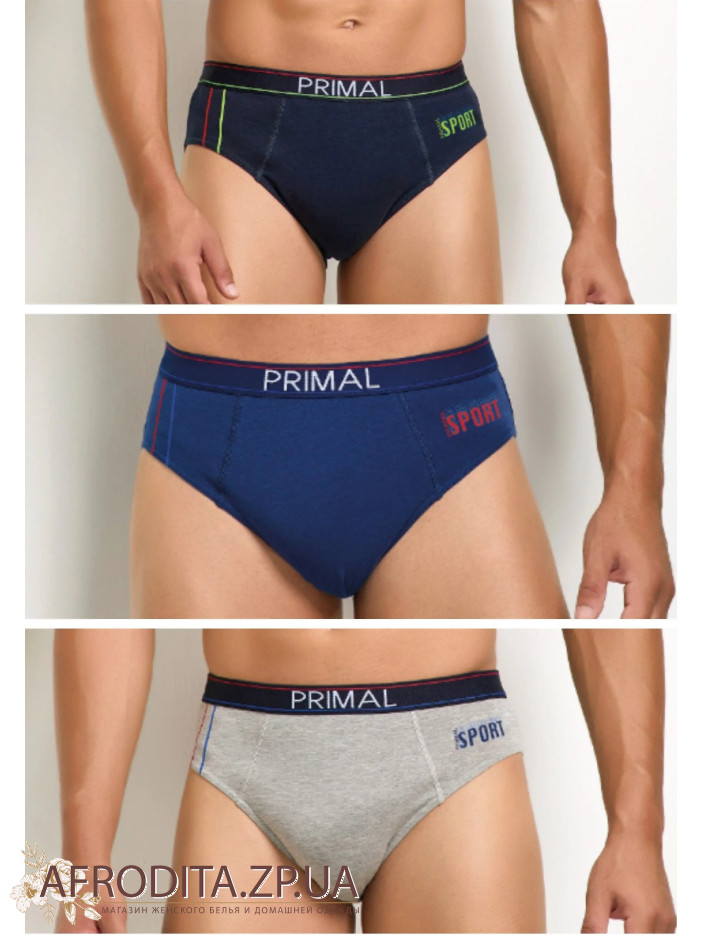 Мужские хлопковые трусы слипы Primal S337. Набор из 3 штук в одной упаковке. Цена указана за 1 ед. Пояс на широкой эластичной резинке с контрастной полоской по кругу и надписью "PRIMAL". Задняя деталь изделия бесшовная. Удобная средняя посадка. Прилегающий фасон, позволяющий сделать трусы практически незаметными под одеждой. Котоновые трусы с добавлением эластана. Модель исполнена в сортивном стиле. В упаковке три цвета – синий, джинс, серый.
