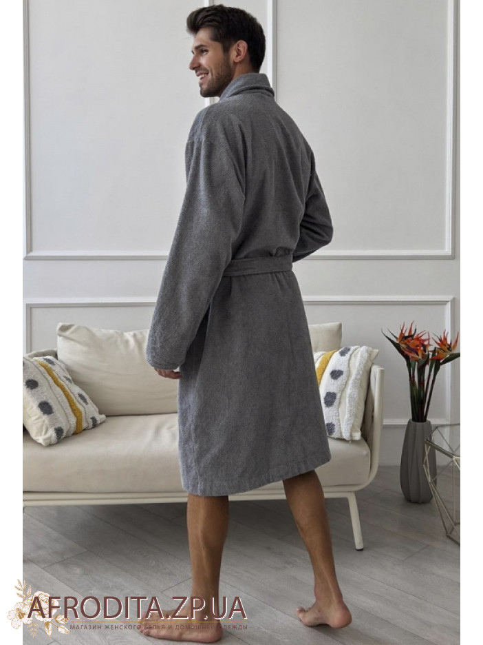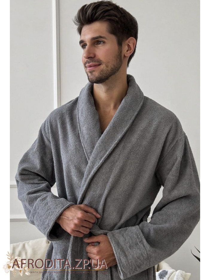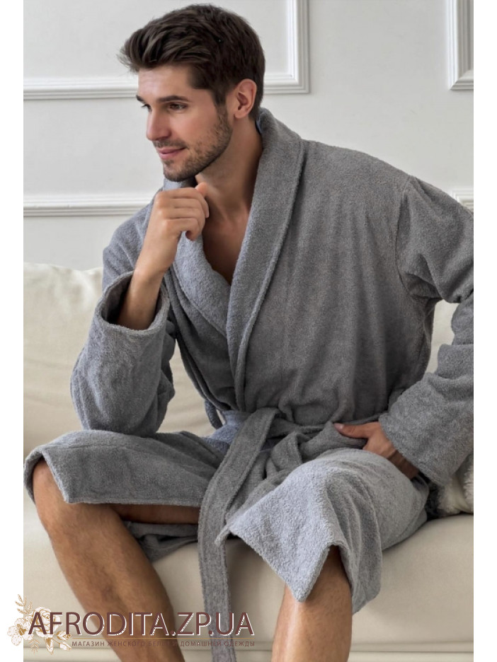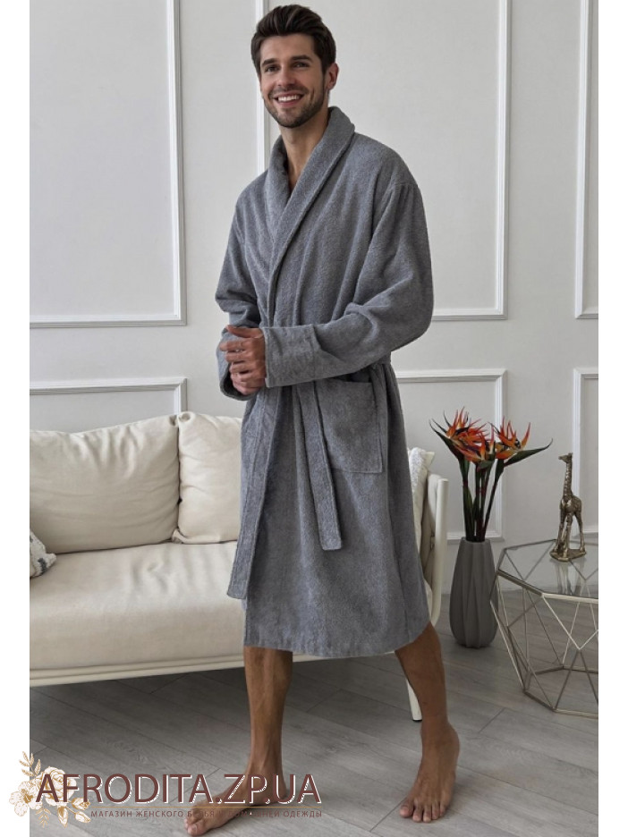 Элегантный мужской халат от украинского бренда Cosy выполнен из мягкой качественной двухсторонней махры серого цвета, имеет свободный силуэт и длину чуть ниже колен, дополнен воротником шаль, длинными рукавами с регулируемыми отложными манжетами и удобными накладными карманами, завязывается на запах поясом, отлично впитывает влагу, позволяет телу дышать, обеспечивает комфорт после душа, бассейна или тренировки и станет стильным подарком для любимого или близкого человека.