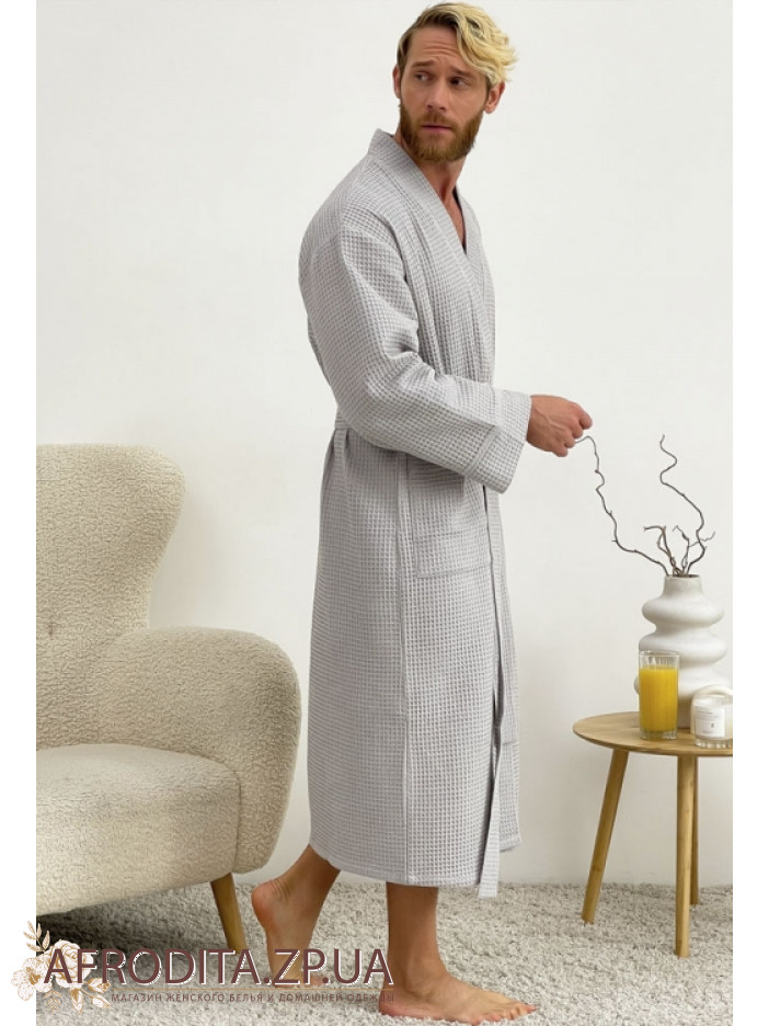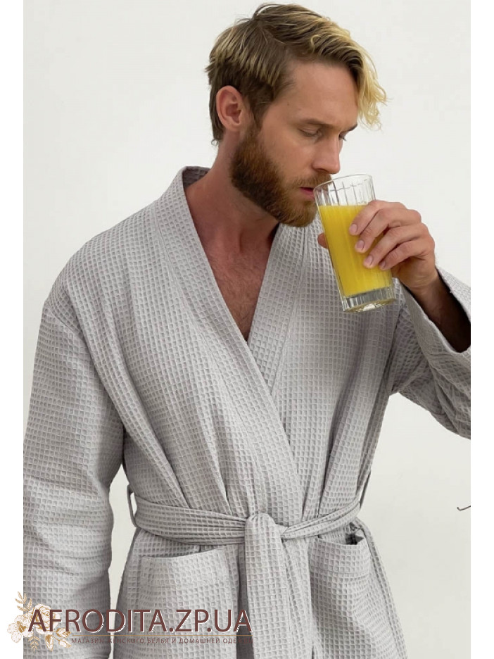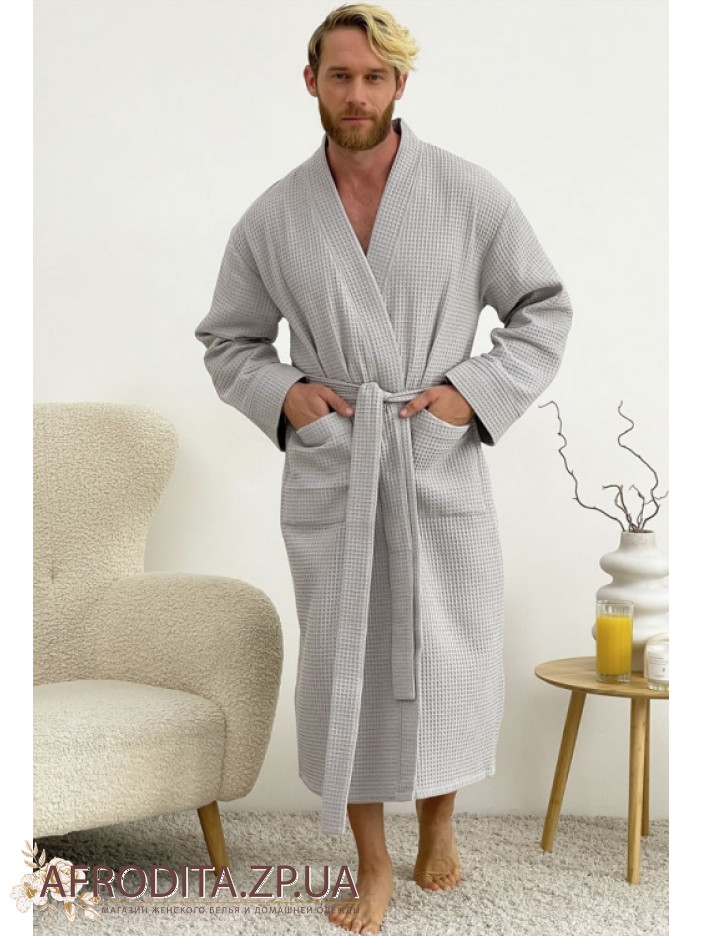 Вафельный мужской халат от украинского бренда Cosy выполнен из мягкого натурального хлопка серого цвета, имеет свободный силуэт и длину ниже колен, дополнен длинными рукавами и удобными накладными карманами, завязывается на запах поясом, отлично впитывает влагу, позволяет коже дышать, дарит комфорт после ванны, сауны, бассейна или тренировки и станет универсальным подарком для любимого или близкого человека.