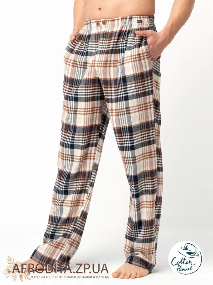 Мужские штаны для дома и отдыха MHT 443 B25 от польского бренда Key изготовленные из мягкой фланели. Модель свободного кроя в клетчатый принт,, по бокам расположены карманы. Штаны на резинке в области талии.