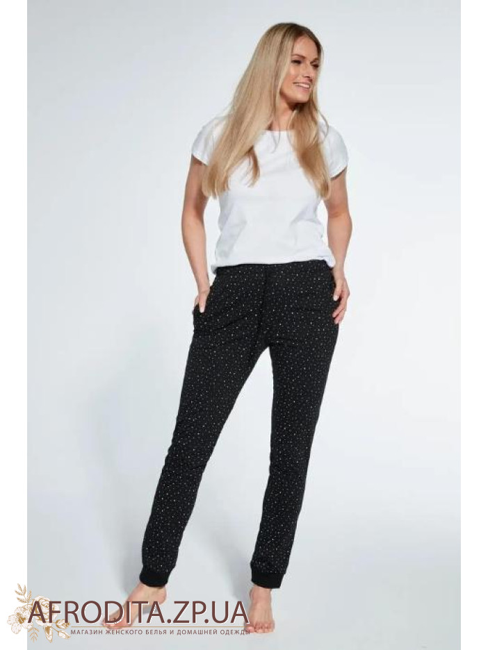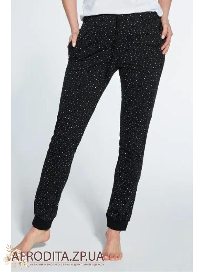 Женские пижамные штаны прямого кроя изготовленные из высококачественного хлопка. Штаны на резинке, линию талии можно регулировать шнурком.