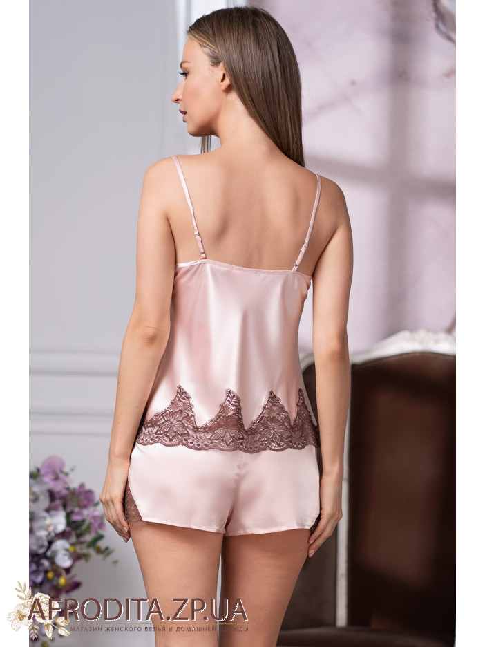 Женская пижама с шортами "Мarilin" 3102 от Mia-Amore. Комплект изготовлен из натурального шелка, топ на тонкой бретельке и декорирован утонченным итальянским кружевом. Нижняя часть шортиков также украшена кружевом.