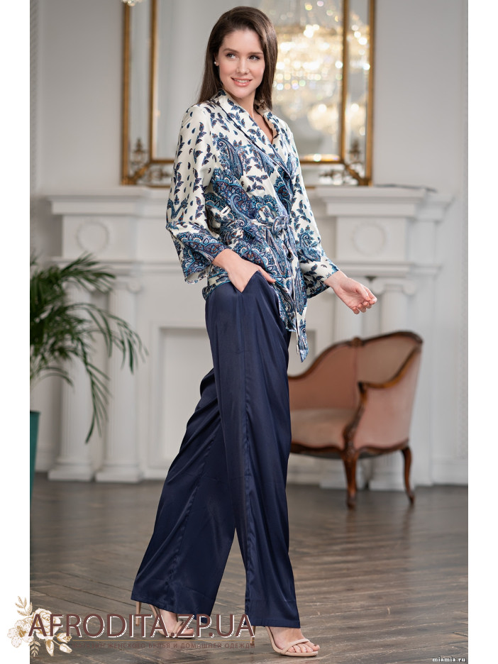Брючный женский комплект "Соломея" 3516 от Mia-Amore изготовленный из натурального шелка. Комплект состоит из жакета с длинным рукавом, который застегивается на пуговицы и однотонных штанов синего цвета. В комплекте прилагается пояс.