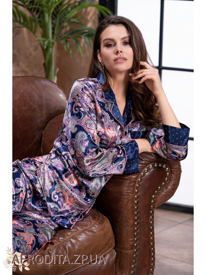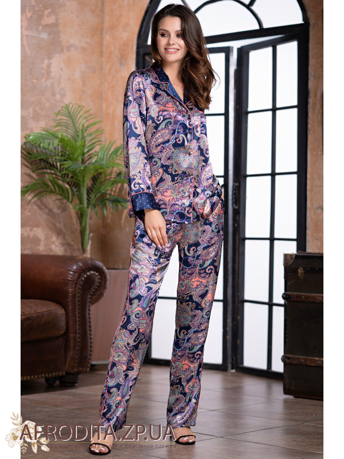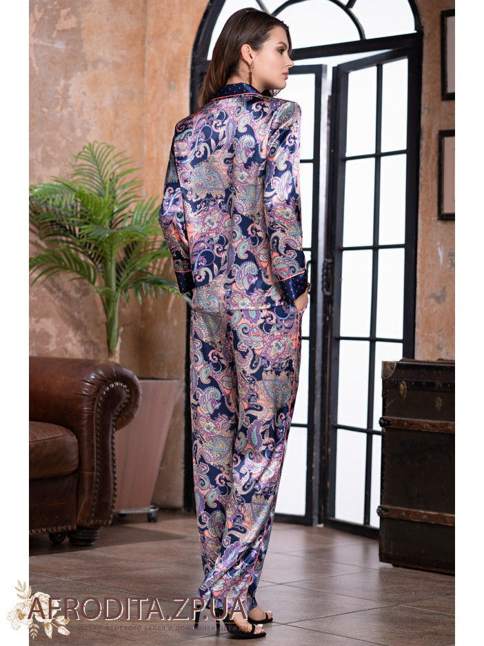 Женская пижама "Эттро" 3506 от Mia-Amore. Пижама выполнена из смесового полотна на основе натурального шелка темно-синего цвета в шикарный восточный принт сиренево-розового цвета, состоит из жакета на пуговицах и прямых брюк. Жакет с длинными рукавами и отложным воротником, брюки с мягкой резинкой в поясе и удобными боковыми карманами. Воротник, манжеты на рукавах и нагрудный карманчик украшены тканью темно-синего цвета в мелкий розовый гороховый принт и обработаны кантом розового цвета, боковая линия брюк также украшена тонким розовым кантом. Пижама очень красивая и элегантная, идеально подчеркнет вечерний женский образ, будет отличным подарком для любимой женщины.