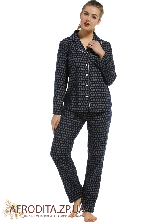Домашний женский комплект "Pastunette" 20212-152-6 из хлопкового полотна. Комплект состоит из жакета с застежками на пуговицах и с длинным рукавом. В области груди расположен накладной карман. Брюки имеют боковые карманы, классической посадки.