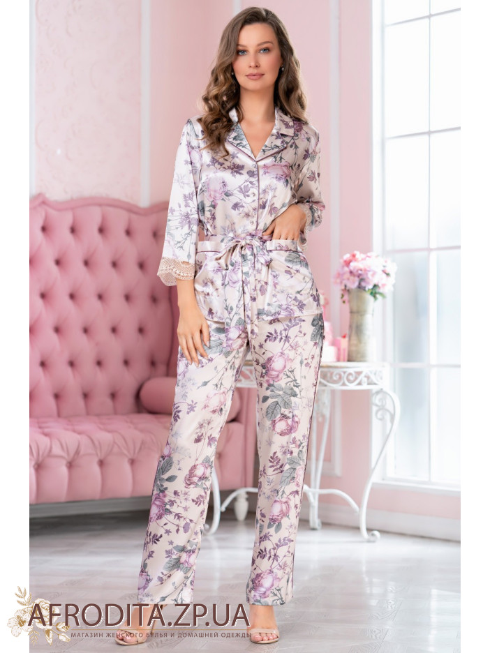 Пижама женская Mia-Amore состоит из жакета и брюк, выполнен из принтованного смесового шелка. Низ рукавов жакета украшен ажурным кружевом.