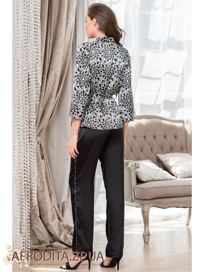 Комплект жакет с брюками Mia-Amore выполнен из принтованного искусственного шелка и черного атласа. Боковые швы черных брюк выполнены с отделкой из принтованного атласа. Жакет с застежкой на пуговицы и рукавами длиной 7/8. По борту, рукавам и карманам декорирован белым кантом. По талии прилегание жакета регулируется поясом.
