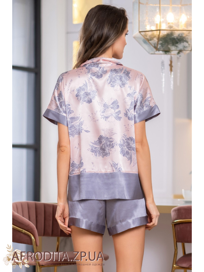 Женская пижама "Альбина" 7164 от Mia-Amore состоит из рубашки с цельнокроеными комфортными короткими рукавами, с центральной застежкой на пуговицы и шорт. Рубашка выполнена из принтованного искусственного шелка, шорты - из однотонного искусственного шелка. Низ рукавов и низ рубашки рубашки декорированы отделкой из серого атласа. Комплект без пояса.