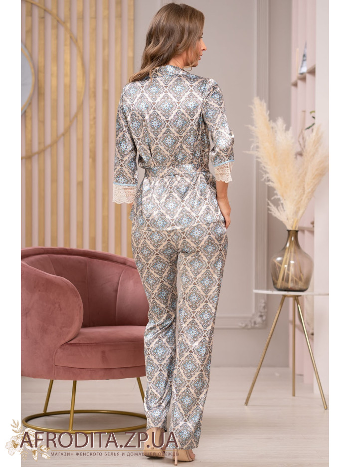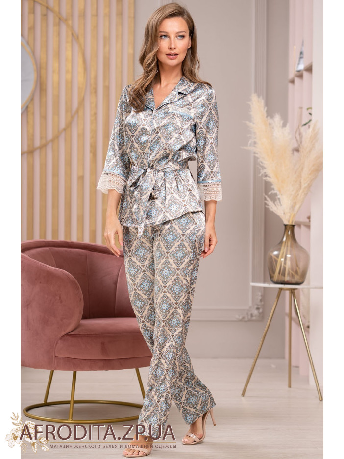 Комплект Палермо 9696 от Mia-Amore состоит из жакета с рукавом ¾ и брюк выполнен из атласного шелка. Кружевные вставки украшают низ рукавов, по бокам брюк расположены карманы. Линию талии можно подчеркнуть за счет пояса, который идет в комплекте.