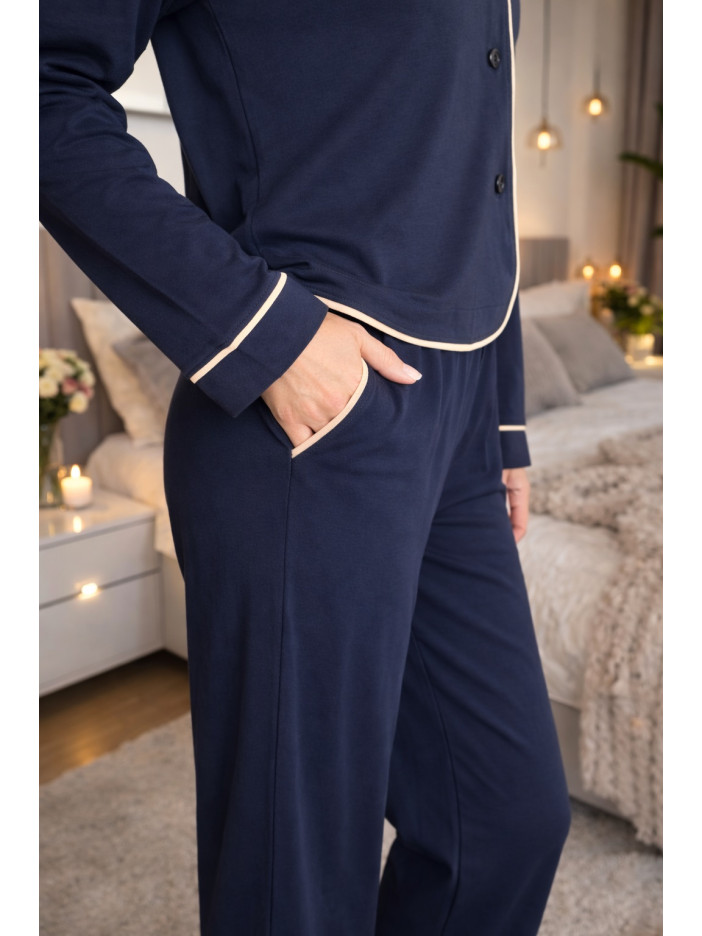 Домашний женский комплект Cosy 82735 от украинского торговой марки. Пижама выполнена в глубоко синем оттенке из высококачественного хлопкового материала. В комплект входит классическая рубашка на пуговицах свободного кроя, рукав длянный декорирован контрастным кантом. Борт изделия, а также воротник также украшен кантом. Брюки прямоно кроя на резинке с боковыми карманами, карманы декорированы кантом бежевого цвета. Пижама выглядит очень стильно и привлекательно, отличный выбор для проведения уютных домашних вечеров.