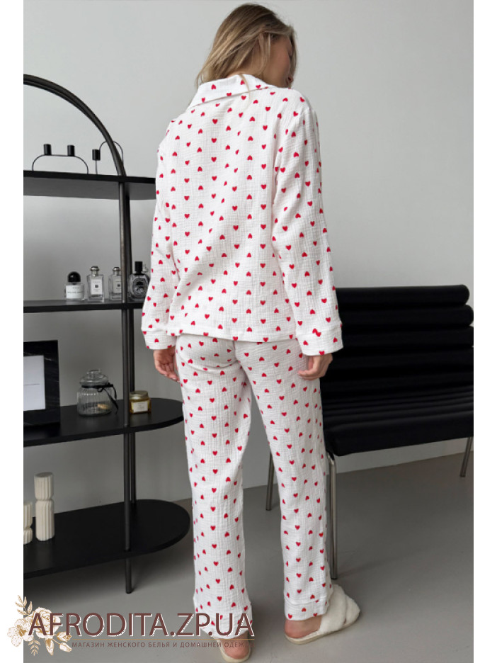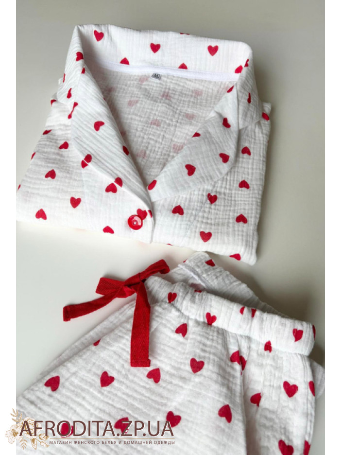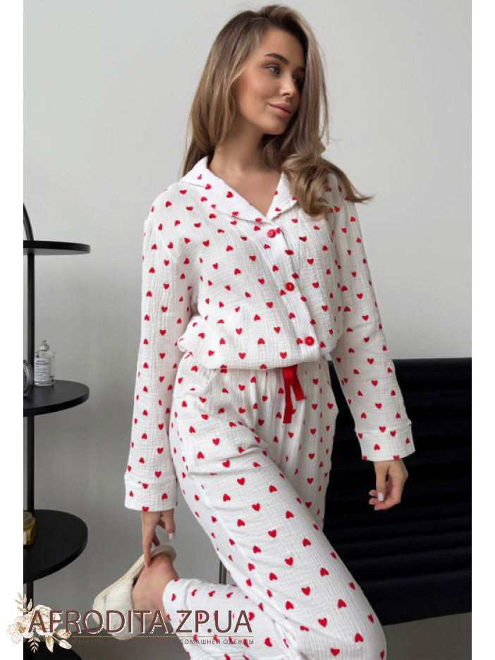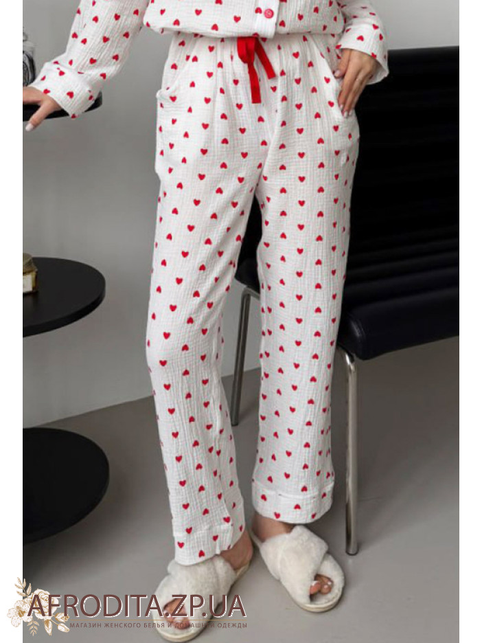 Домашний женский комплект со штанами от украинского бренда Cosy изготовленный из муслина на основе хлопка. Пижама белого цвета с с принтом в виде красных сердечек. В комплект входит рубашка на пуговицах прямого силуэта, воротник рубашечного типа, Рукав длинный. Штаны прямого кроя на резинке, линия талии регулируется шнурком. Комплект очень мягкий и приятный на ощупь и отлично послужит подарком близкому человеку.