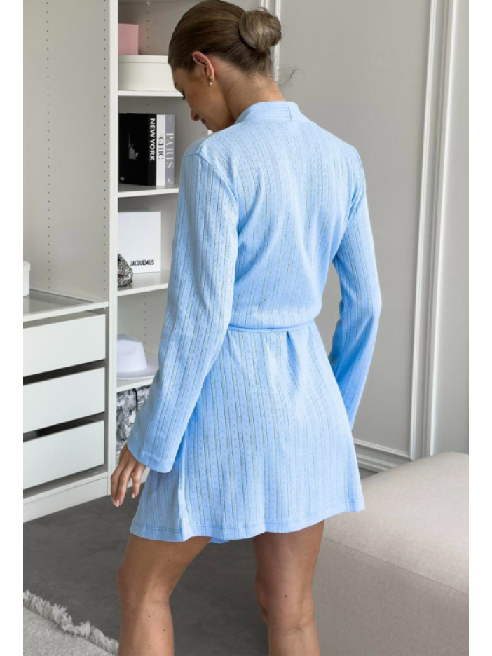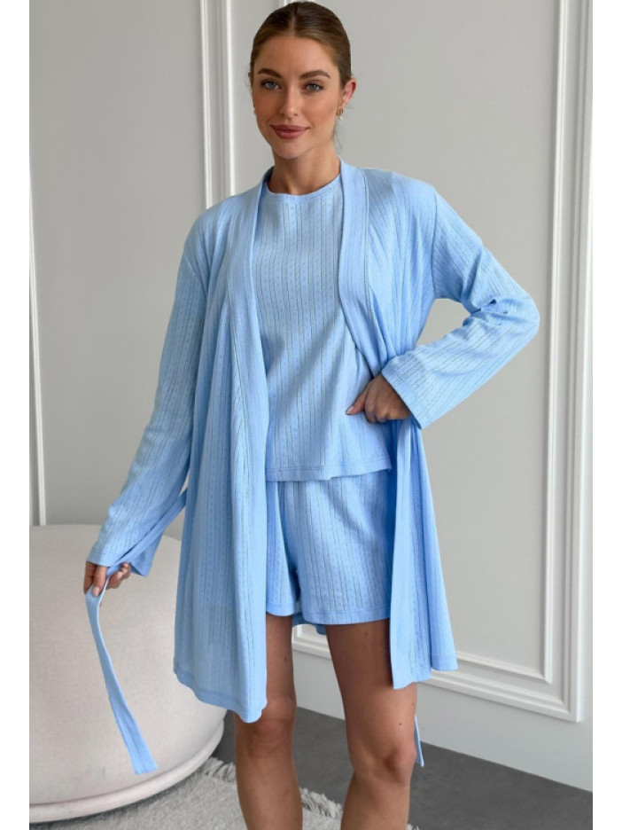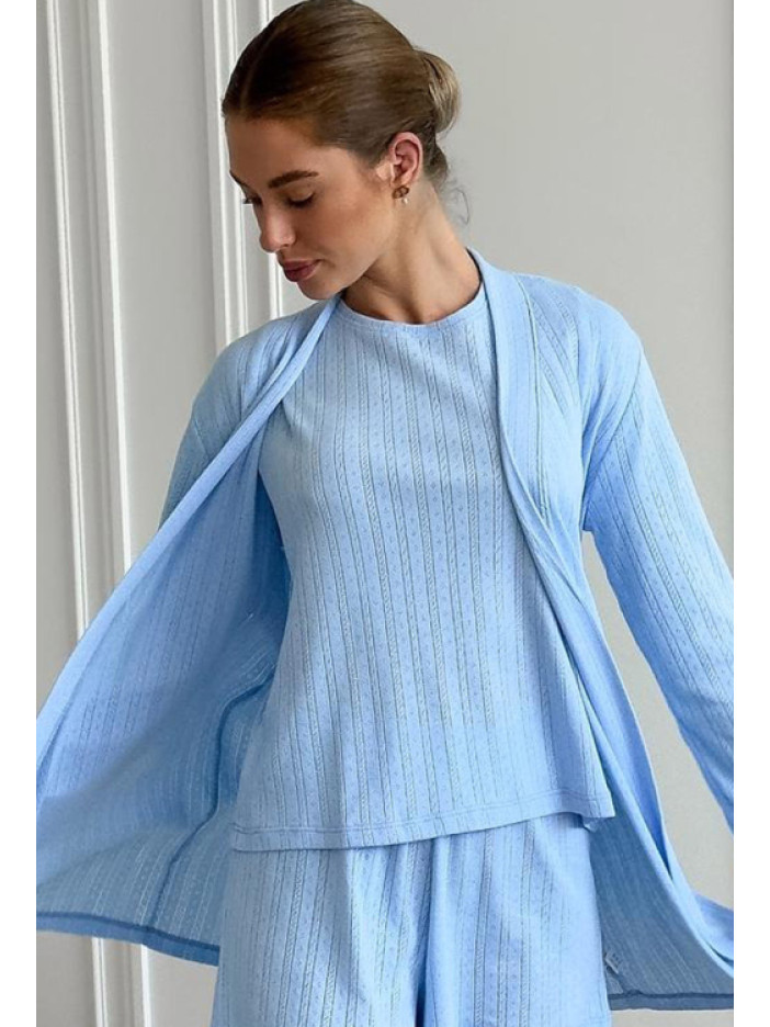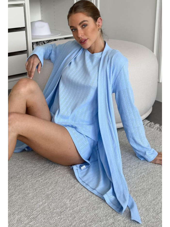 Невероятно комфортный женский комплект от украинского бренда Cosy — идеальное решение для уюта и отдыха, выполнен из мягкого качественного хлопка с ажурной фактурой в полоску с изящным голубым орнаментом, комплект включает футболку прямого силуэта с короткими рукавами и круглым вырезом, удобные шорты прямого кроя с мягкой эластичной резинкой и лёгкий халат с длинными рукавами длиной выше колена, который завязывается на запах с помощью пояса, продуманный крой обеспечивает свободу движений и максимальный комфорт, стильный и нежный вариант для дома, отдыха на даче и приятных моментов для себя, а также отличный подарок для близкого человека