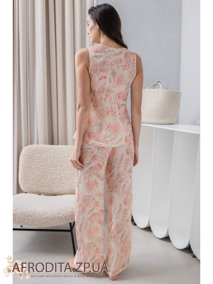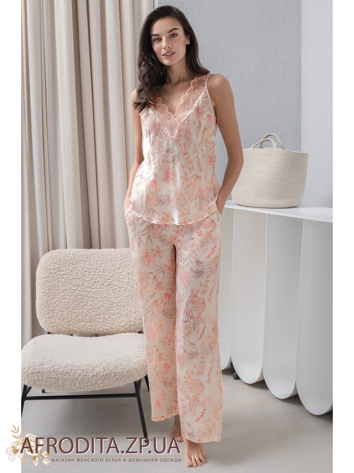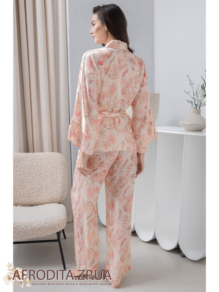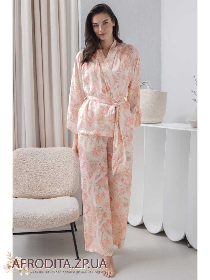 Женский комплект 3-ка Молли 1926 от Mia-Amore состоит из  жакета на запах с длинным широким рукавом, топа на широких кружевных бретелях и широких брюк с карманами в боковом шве. Комплект выполнен из принтованного смесового шелка. Декор-атласный бантик с подвеской по центру выреза топа. Линию талии можно подчеркнуть за счет пояса, который идет в комплекте. Пижама выглядит очень роскошно, ткань очень мягкая и приятная к телу. Итличная идея для подарка близким и родным.