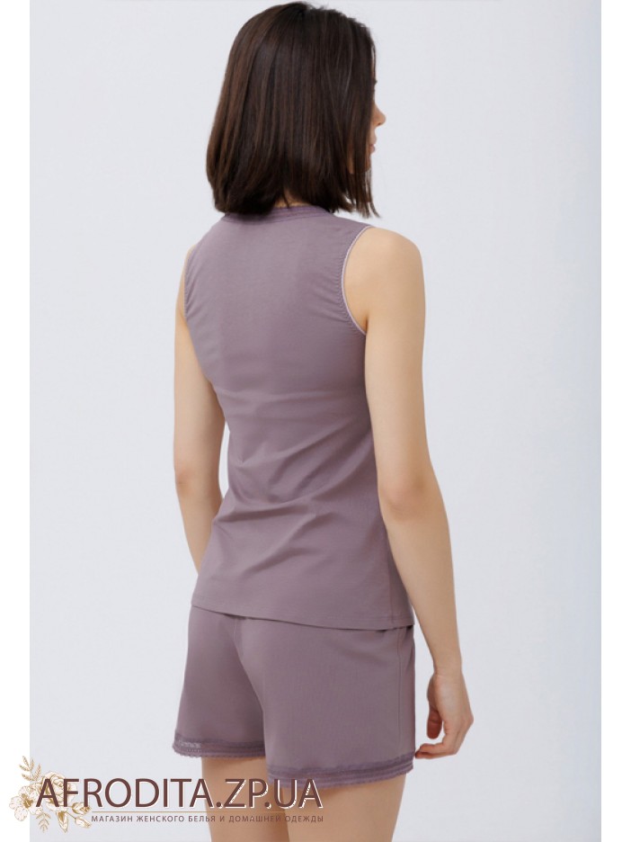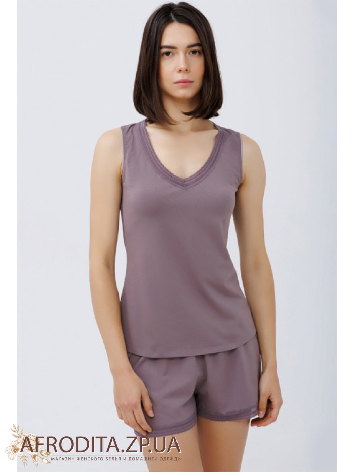 Пижама женская с шортами Roksana 82788 из трикотажной ткани на основе хлопка от Roksana. Пижама состоит из майки свободного кроя на широких бретелях. Глубокий вырез декольте украшен кружевом в цвет ткани. Шорты на мягкой резинке с кружевной отделкой с низу.
