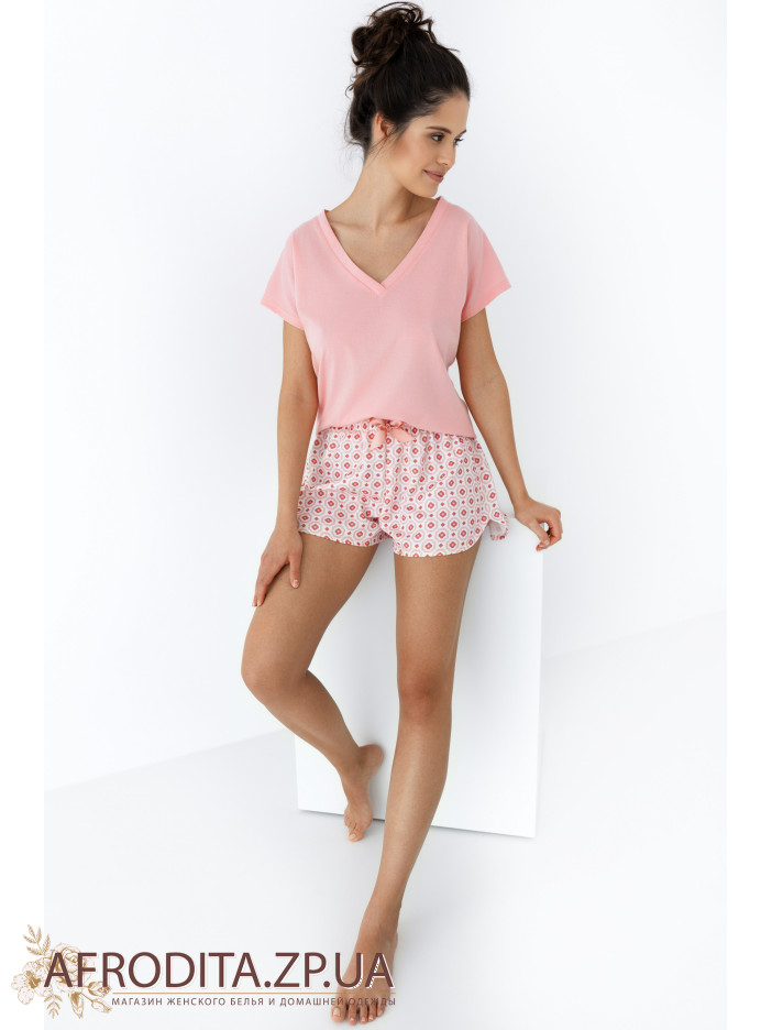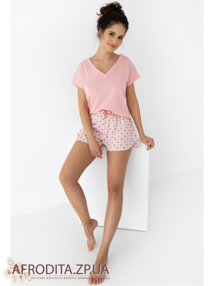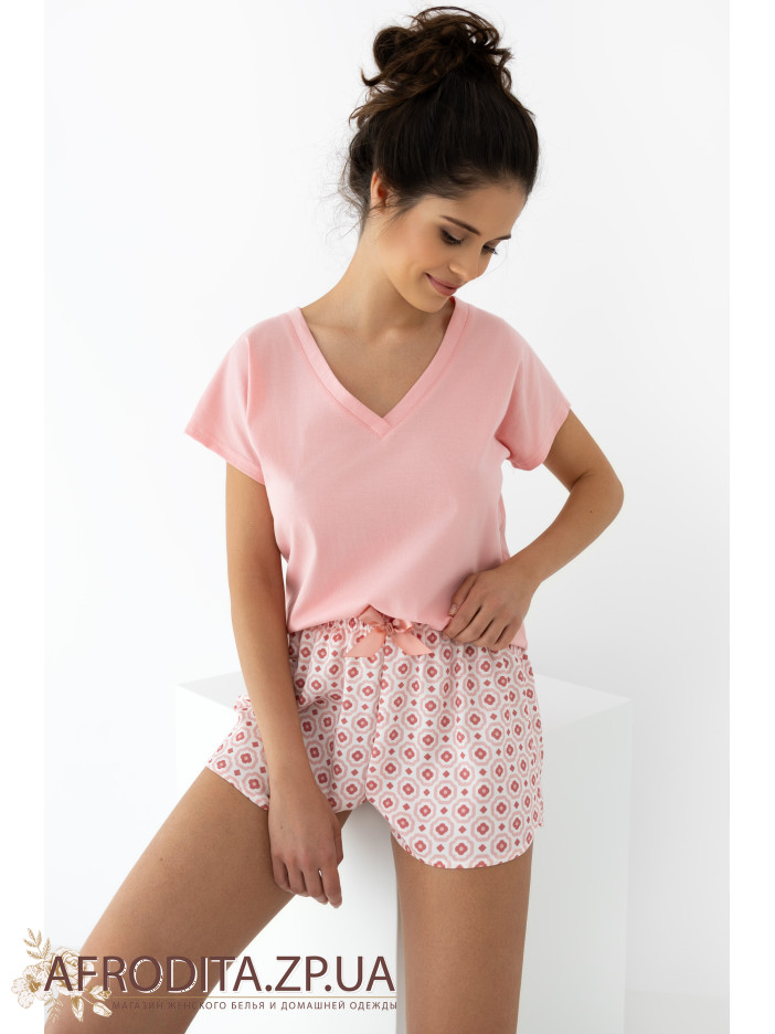 Пижама женская с шортами от польской торговой марки Sensis изготовленная из нежной и очень приятной к телу вискозы. Комплект состоит из футболки свободного кроя с короткими рукавами и V-образным вырезом горловины. Шорты короткие на резинке с геометрическим принтом, по центру пояса расположен атласный бантик. Пижама выглядит стильно и может быть отличной идеей для подарка вашему близкому человеку.