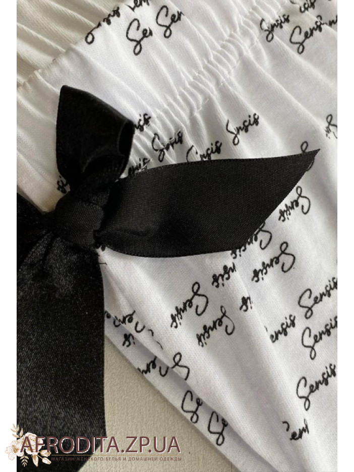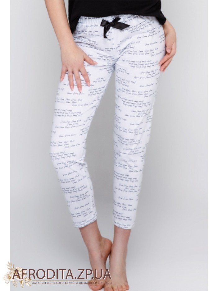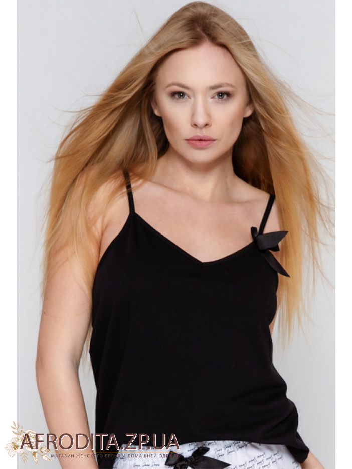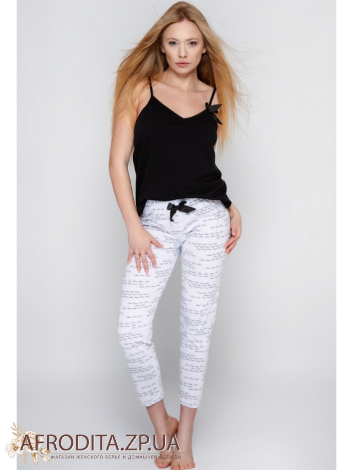 Пижама женская со штанами Sensis Antonella из трикотажного полотна на основе хлопка. В комплект входит черная майка на тонких бретелях, бретели регулируются. Штаны на резинке и немного заужены к низу, на поясе расположен черный атласный бантик.