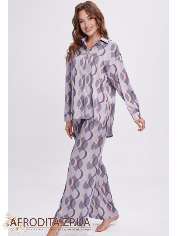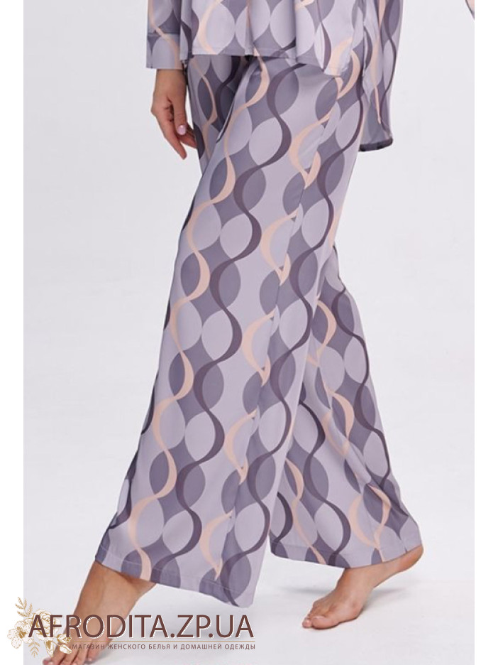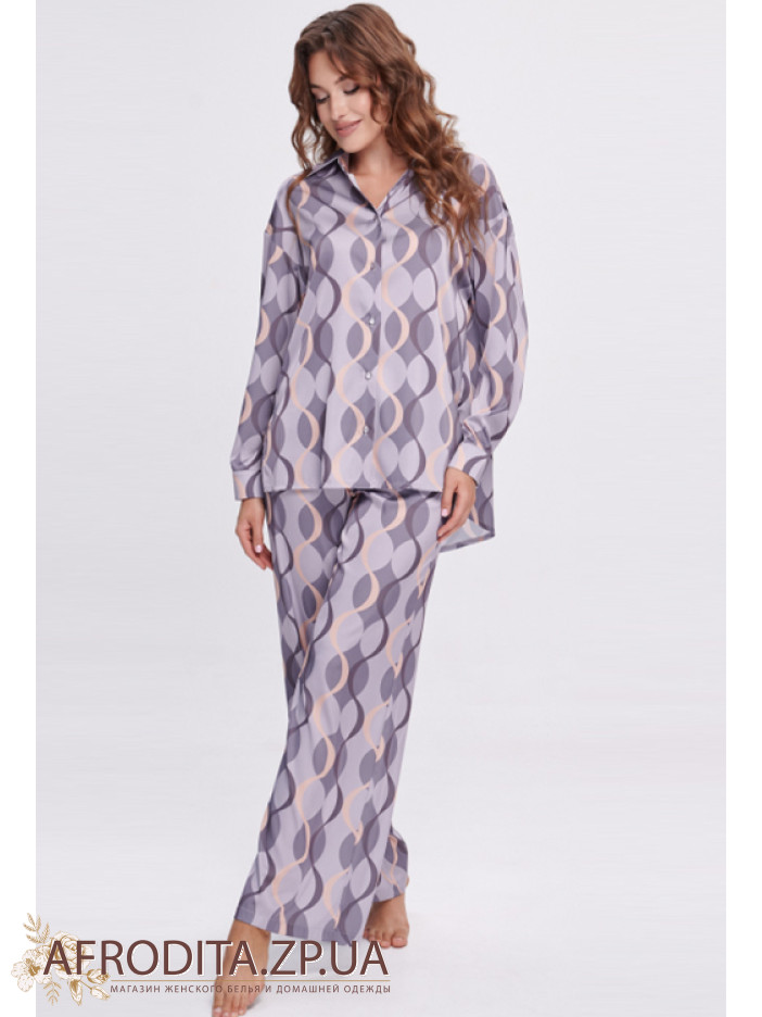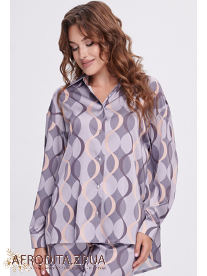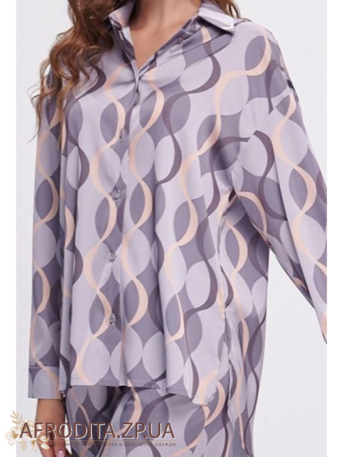 Стильная и невероятно комфортная женская пижама от украинского бренда Shato станет идеальным выбором для уютного и элегантного домашнего образа. Модель выполнена из мягкого, приятного к телу шелка Армани благородного оттенка капучино с серым графическим принтом.Комплект состоит из свободной рубашки и широких брюк. Рубашка с длинными рукавами и классическим отложным воротником застёгивается на пуговицы. Спущенная линия плеч и широкие манжеты на пуговицах подчёркивают современный крой. Слегка удлинённая спинка оформлена кокеткой и продольной встречной складкой, а боковые разрезы по низу добавляют модели лёгкости и свободы движений.Брюки с комфортной посадкой и мягкой эластичной резинкой на талии обеспечивают максимальное удобство в носке. Пижама не только красиво смотрится, но и дарит ощущение уюта, делая её отличным вариантом домашней одежды и прекрасным подарком для любимого или близкого человека.