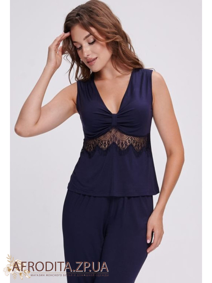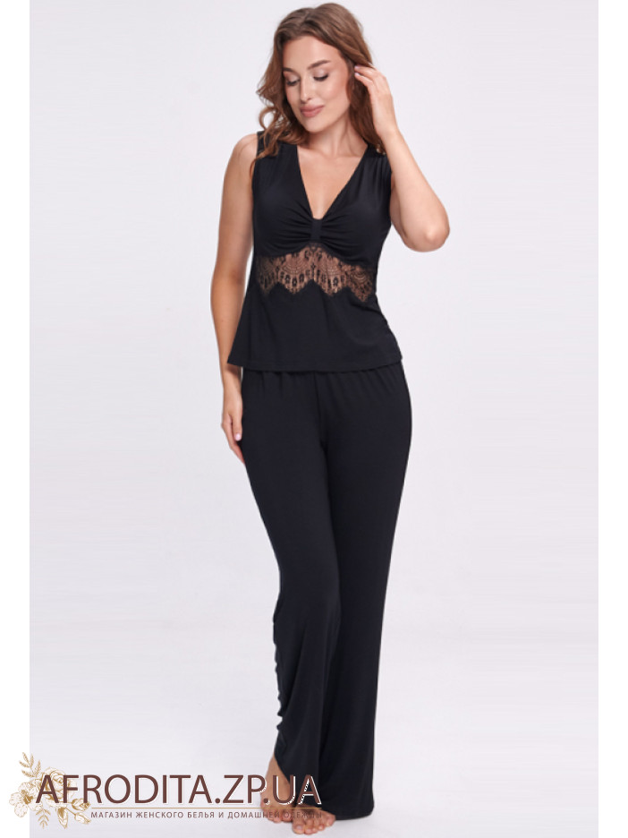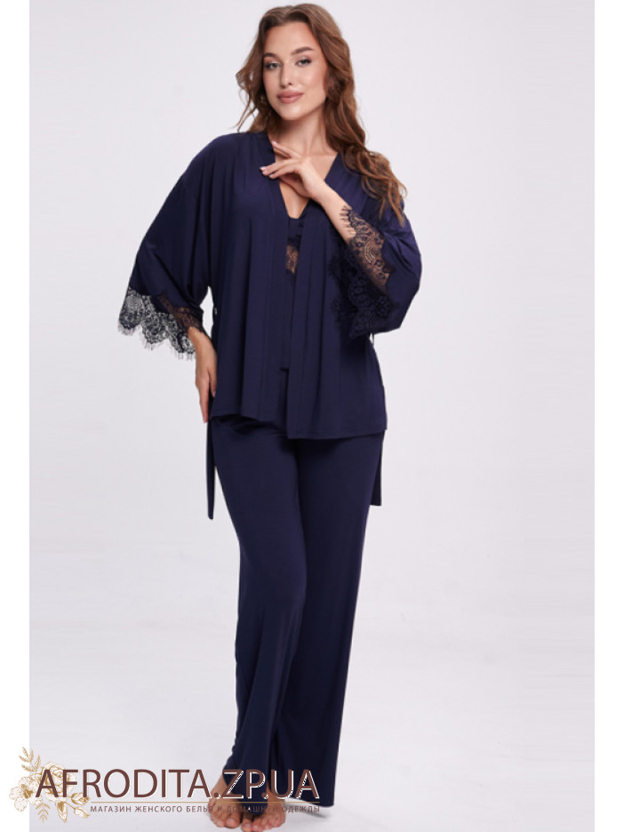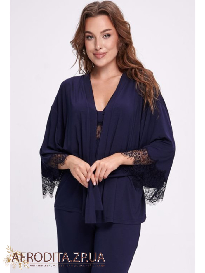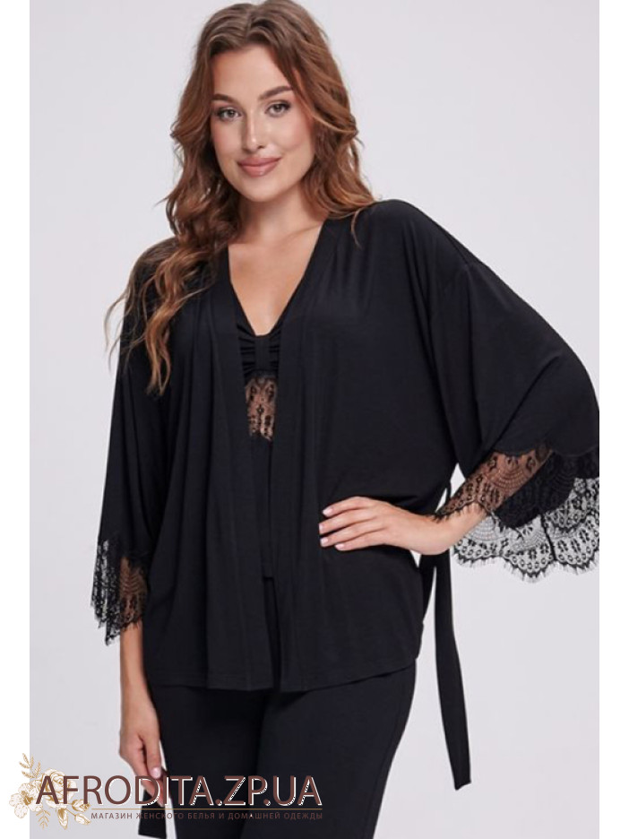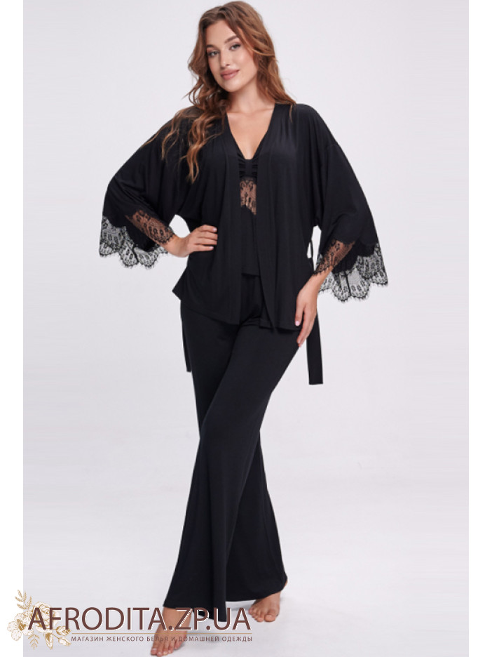 Роскошный женский пижамный комплект от украинского бренда Shato — гармоничное сочетание элегантности, женственности и комфорта. Модель выполнена из мягкой, приятной к телу вискозы глубокого чёрного цвета, идеально подходящей для отдыха и уютных домашних образов. Комплект включает рубашку, майку и брюки, создавая продуманный и стильный ансамбль. Рубашка свободного кроя с широкими рукавами длиной 3/4 выполнена на запах и фиксируется поясом, красиво подчёркивая линию талии и обеспечивая комфортную посадку. Рукава украшены изысканным кружевом с волнистым краем и нежными «ресничками», добавляющими образу утончённости и изящества. Майка полуприлегающего силуэта на широких бретелях с V-образным вырезом эффектно подчёркивает зону декольте. Декоративная сборка по центру лифа и кружевная вставка под грудью создают романтичный акцент и визуально смягчают силуэт. Свободные брюки с мягкой эластичной резинкой на талии дарят ощущение лёгкости и максимального комфорта. Этот комплект станет не только стильным элементом домашнего гардероба, но и прекрасным подарком для любимого или близкого человека, подчёркивающим заботу и внимание.