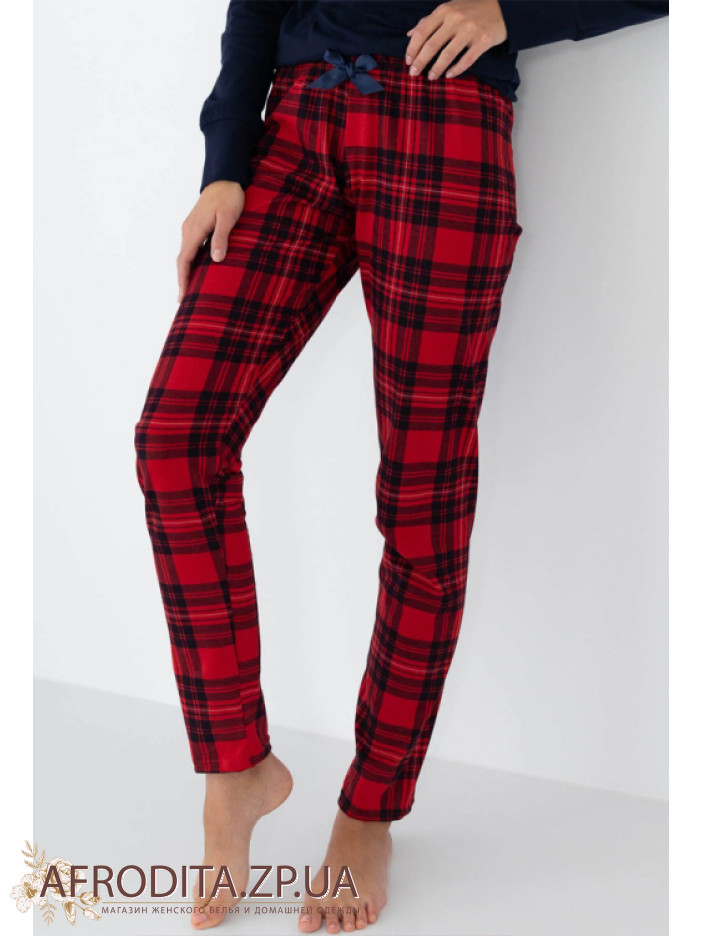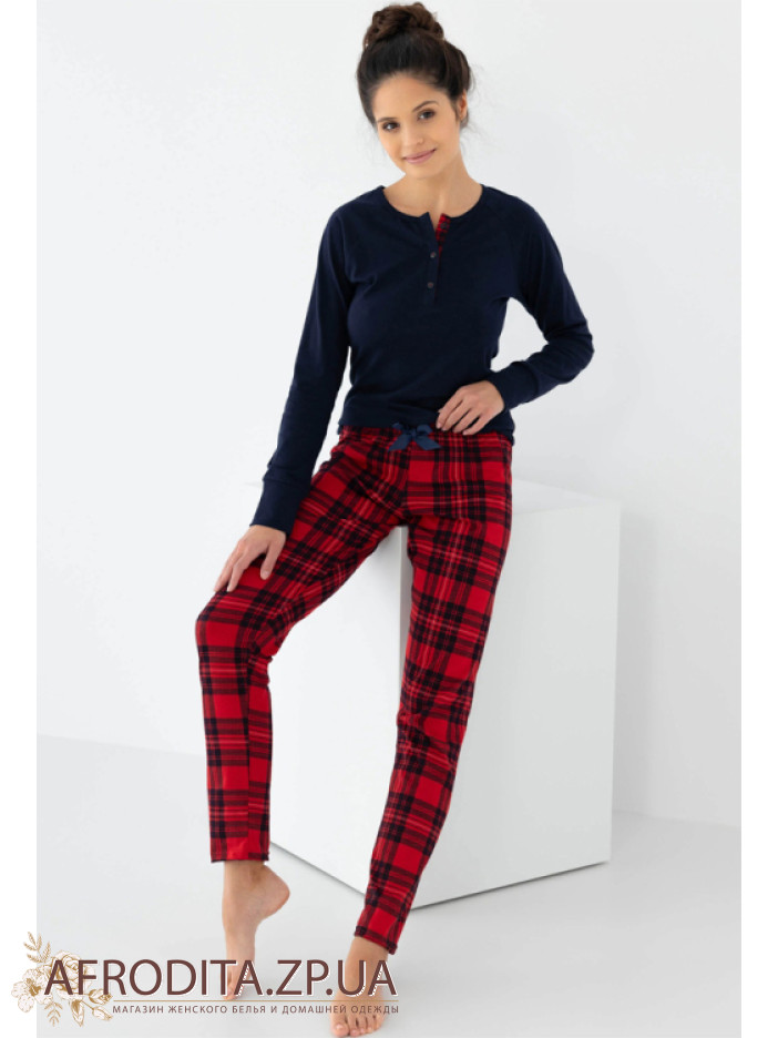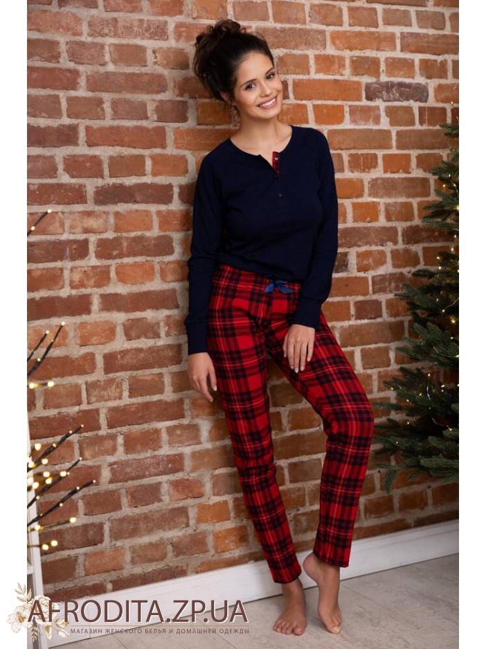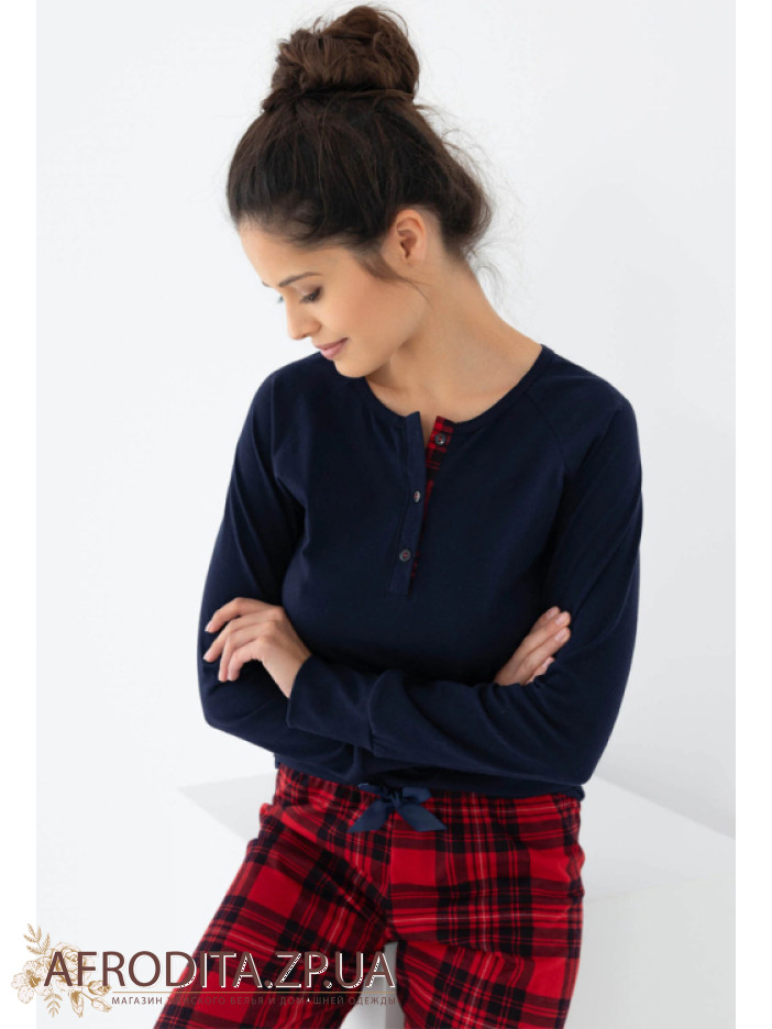 Пижама женская со штанами Sensis Yvette из трикотажного полотна. В комплект входит джемпер темно-синего цвета с длинными рукавами и штанов в шотландскую клетку на резинке.