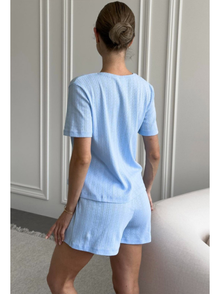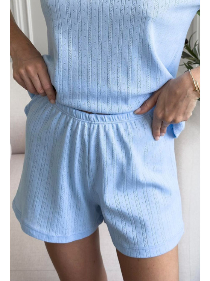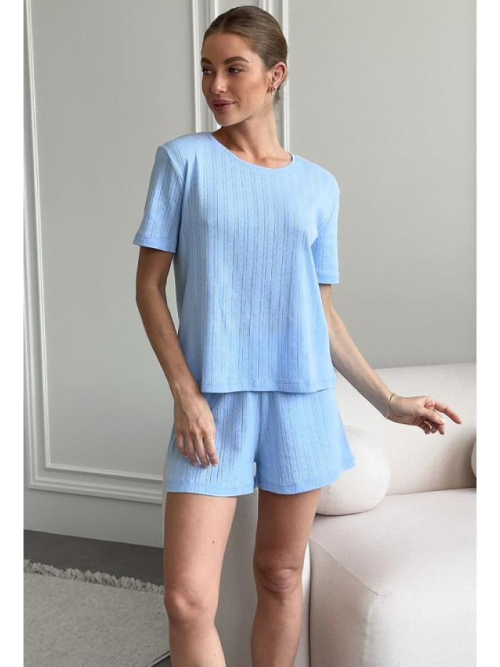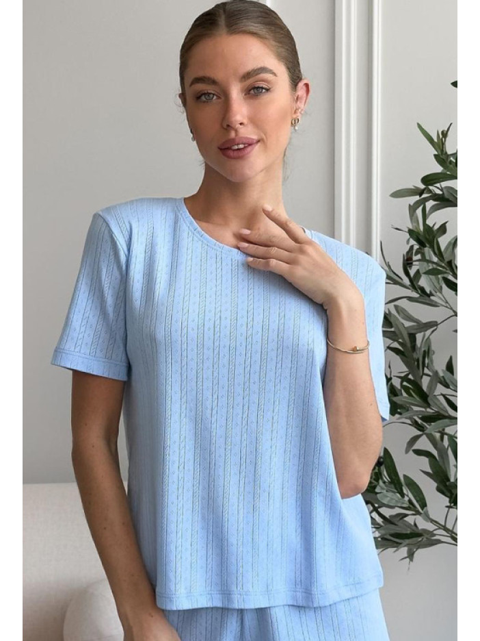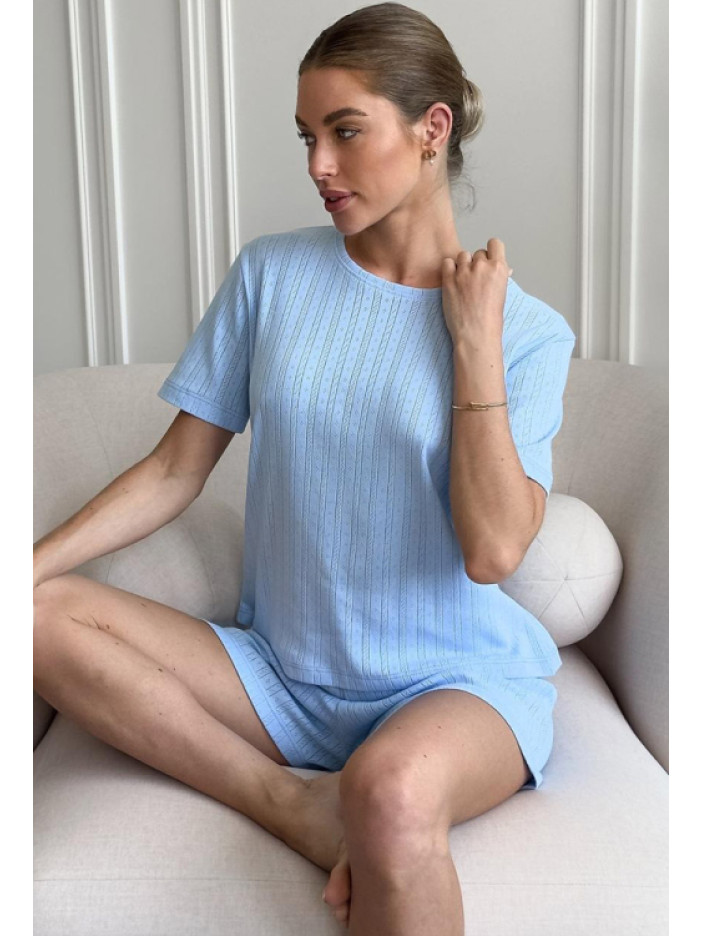 Нежная женская пижама от украинского бренда Cosy — лёгкий и уютный комплект для сна и отдыха, выполнен из мягкого качественного хлопка с ажурной фактурой в полоску с изящным голубым орнаментом, комплект состоит из футболки прямого силуэта с короткими рукавами и круглым вырезом и удобных шорт прямого кроя с мягкой эластичной резинкой на поясе, ткань приятна к телу и обеспечивает комфорт в течение всей ночи, стильный и воздушный вариант для дома, который также станет прекрасным подарком для близкого человека