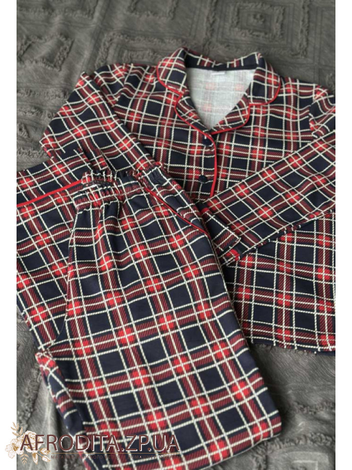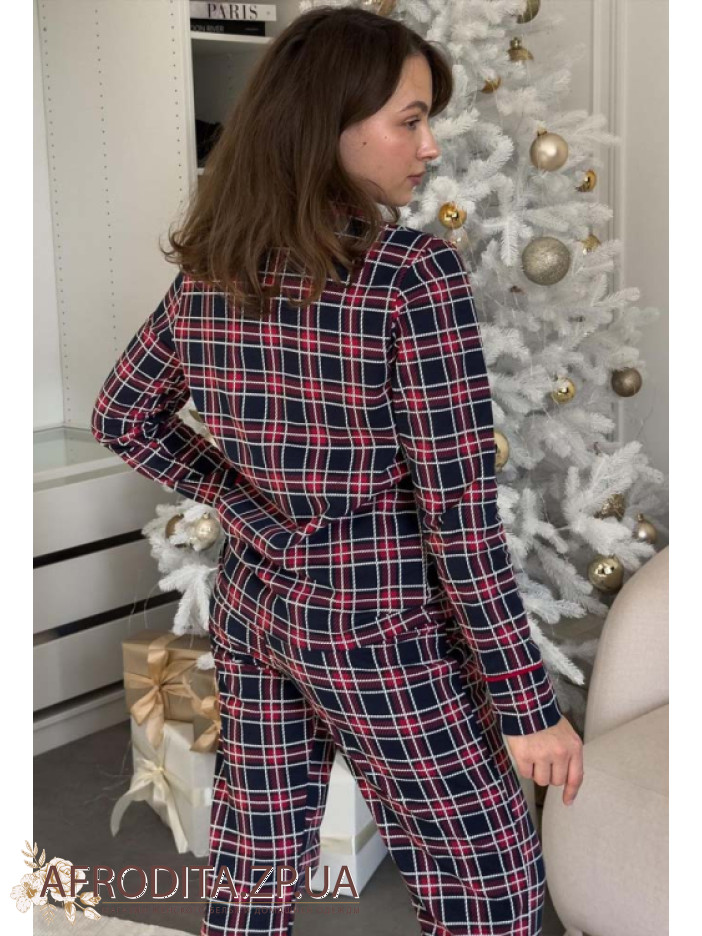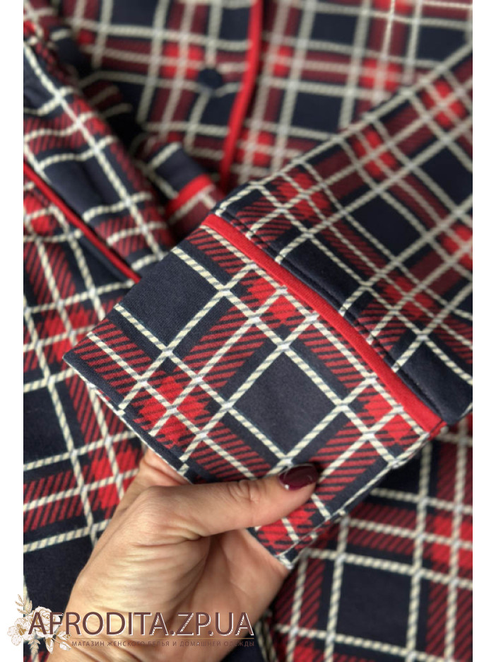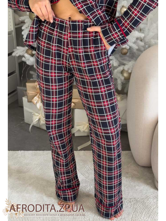 Женская байковая пижама со штанами от украинской торговой марки Cosy. Модель изготовлена из хлопка, в комплект входит рубашка на пуговицах в синюю клетку, рукав длинный. Воротник рубашечного типа, борт, рукава и воротник декорированы красным кантом. Штаны прямого кроя на мягкой резинке. По бокам расположены карманы. Модель отлично подойдет в качестве подарка близкому вам человеку.
