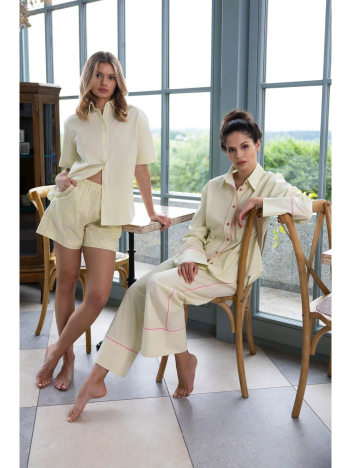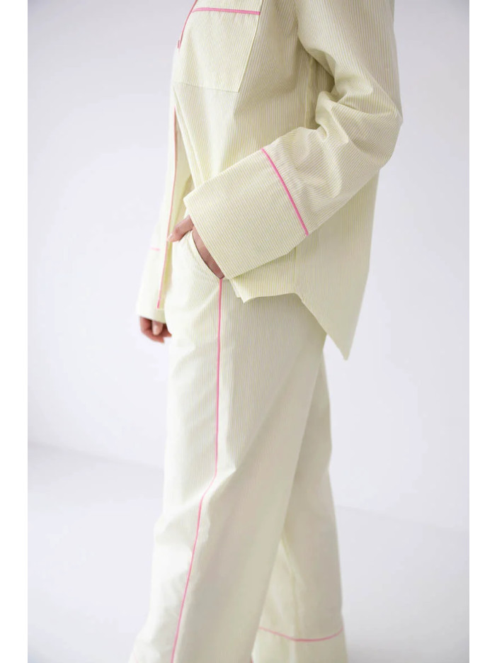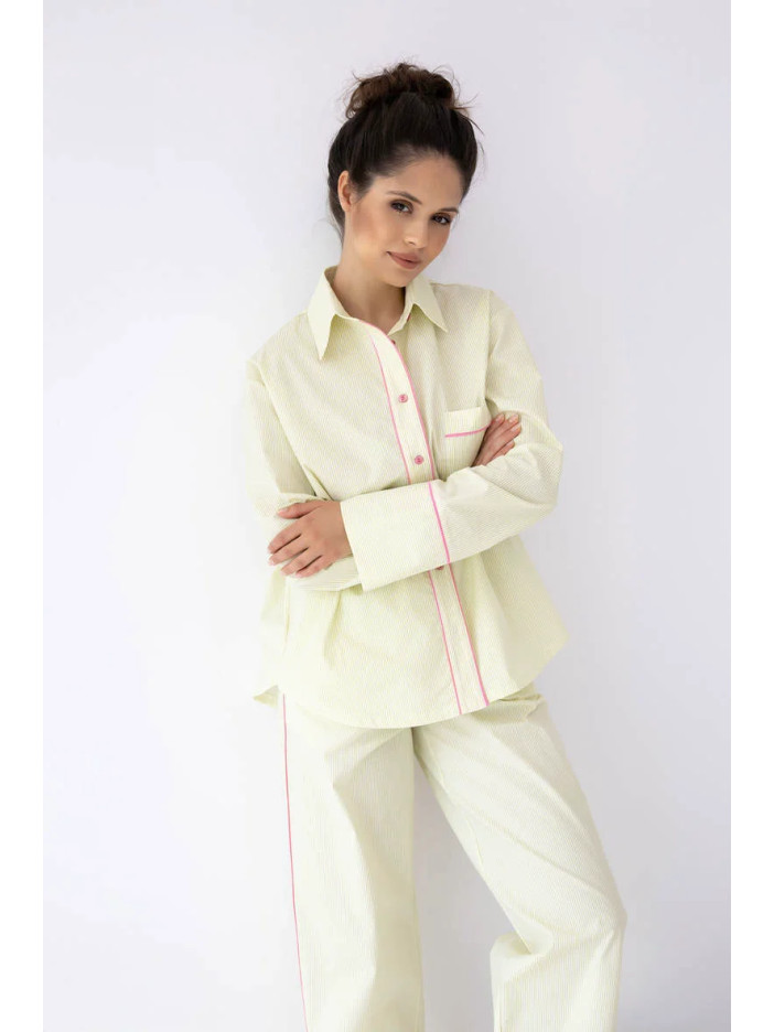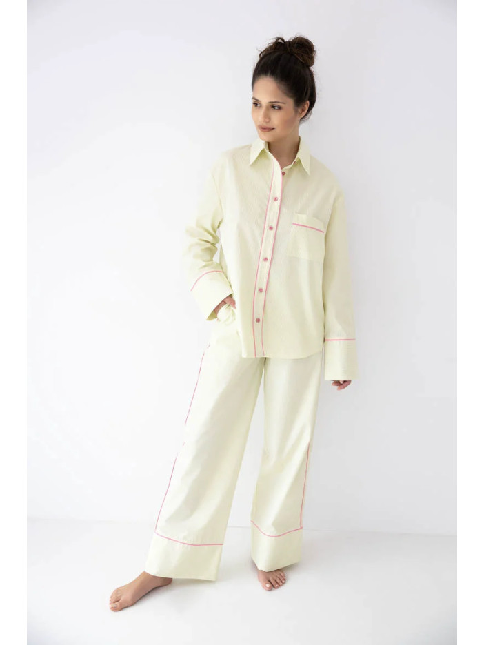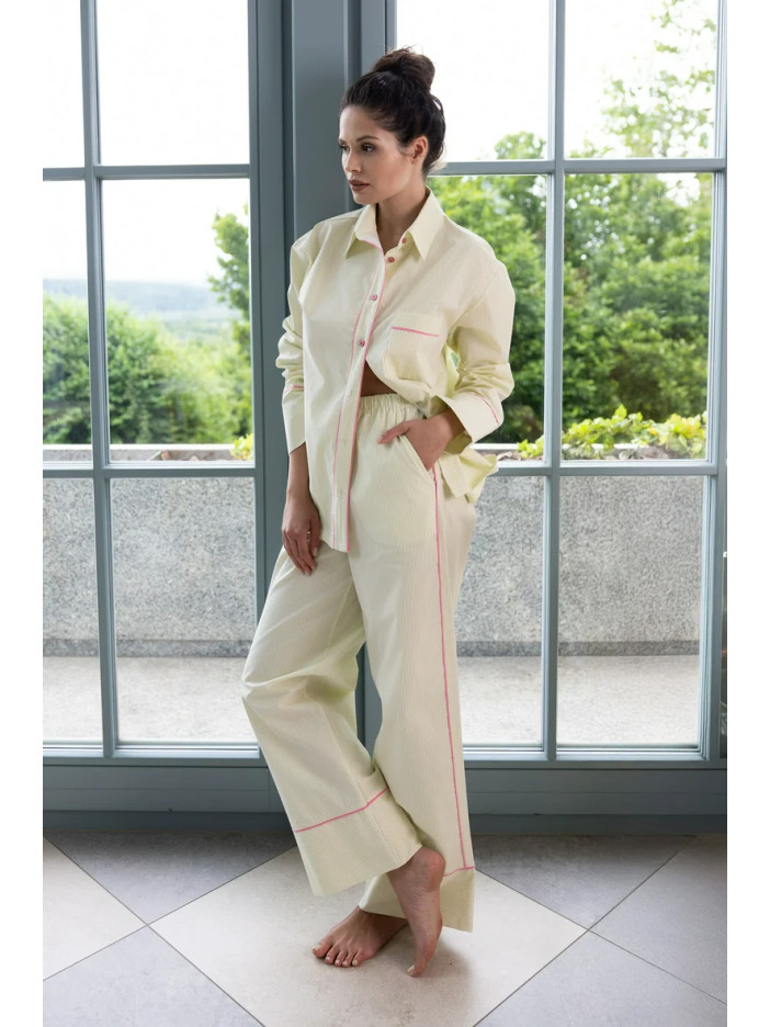 Классическая женская пижама со стильными акцентами — идеальный выбор для тех, кто ценит элегантность даже дома: нежная светло-жёлтая полоска гармонично сочетается с ярким розовым кантом, создавая свежий и современный образ, рубашка с длинными рукавами и застёжкой на пуговицы выглядит аккуратно и утончённо, лёгкая и приятная на ощупь ткань дарит комфорт в течение всей ночи, а свободные брюки с широким кроем и удобными боковыми карманами обеспечивают максимальную свободу движений и уют