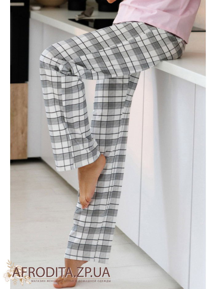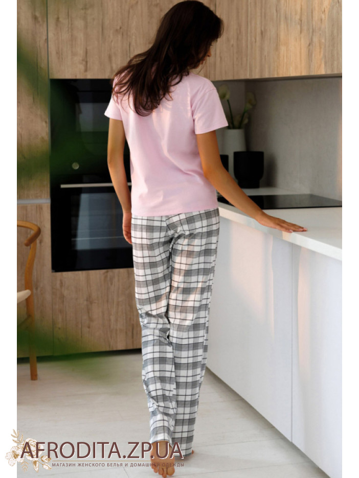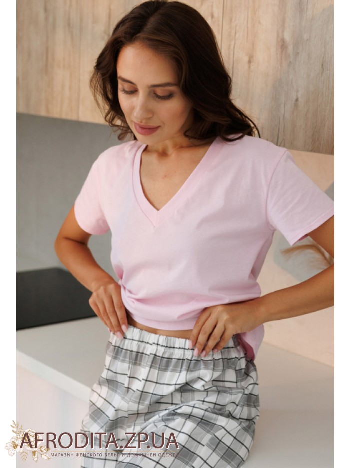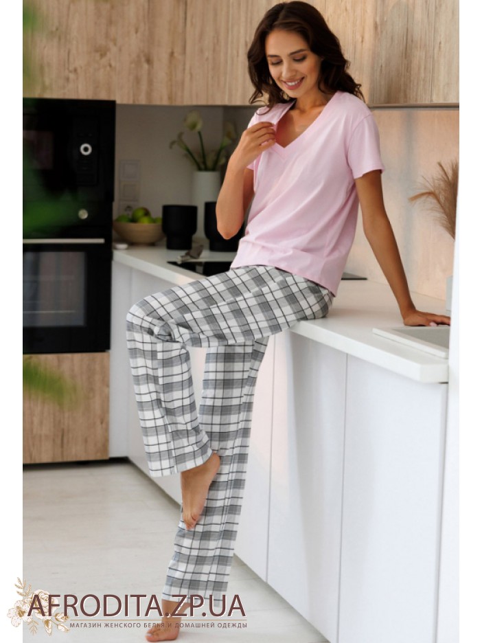 Женская пижама с брюками 1875-12050 из трикотажной ткани на основе хлопка. В комплект входит футболка нежно-розового цвета с короткими рукавами, Горловина имеет V-образную форму. Штаны к клетку свободного кроя на резинке в области талии. Модель очень комфортная и практичная и может подойти в качестве подарка близким вам людям.