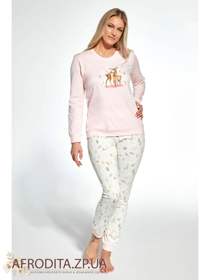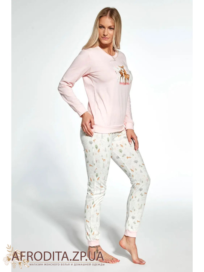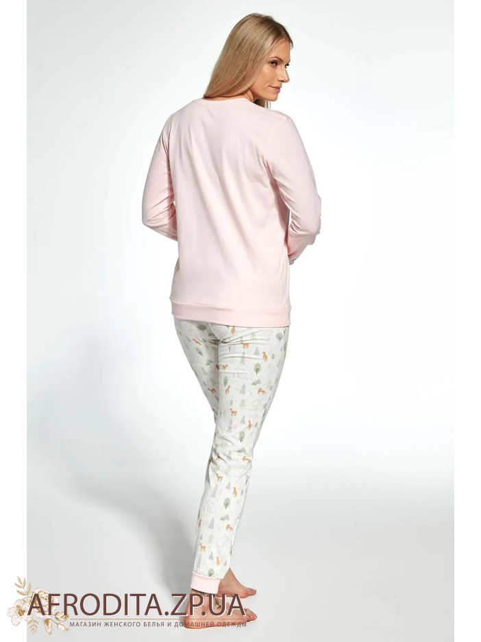 Женская пижама с брюками 467-23 изготовленная из мягкого и очень приятного к телу хлопка. В комплект входит джемпер с длинными рукавами и штаны на резинке прямого кроя.