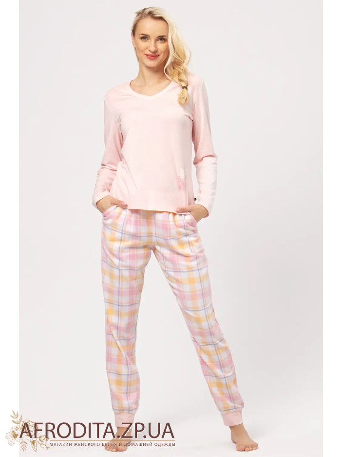 Женская пижама с брюками LNS 664 B24 из хлопка. Комплект состоит из однотонного джемпера с длинными рукавами и штанов на резинке в клетку, по бокам расположены карманы.