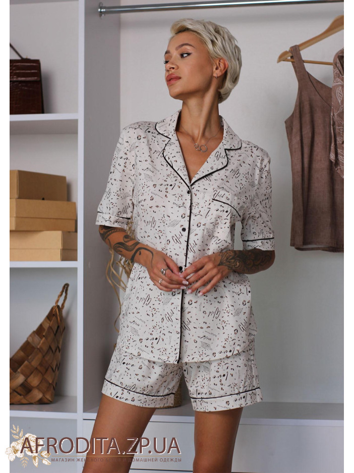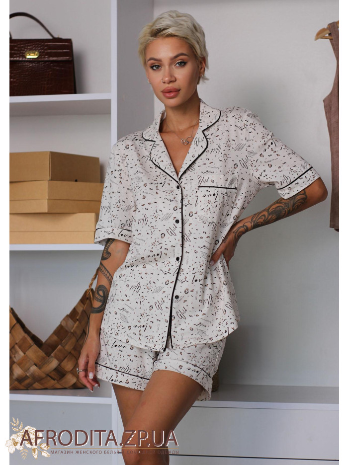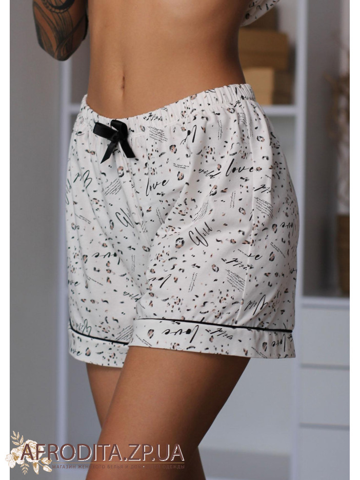 Женская пижама с шортами 1416-16039 изготовленная из высококачественного шелка. Комплект состоит из рубашки на пуговицах, на груди расположен декоративный карман. Шорты на резинке с кокетливым черным бантиком.