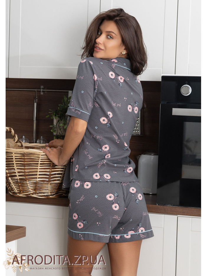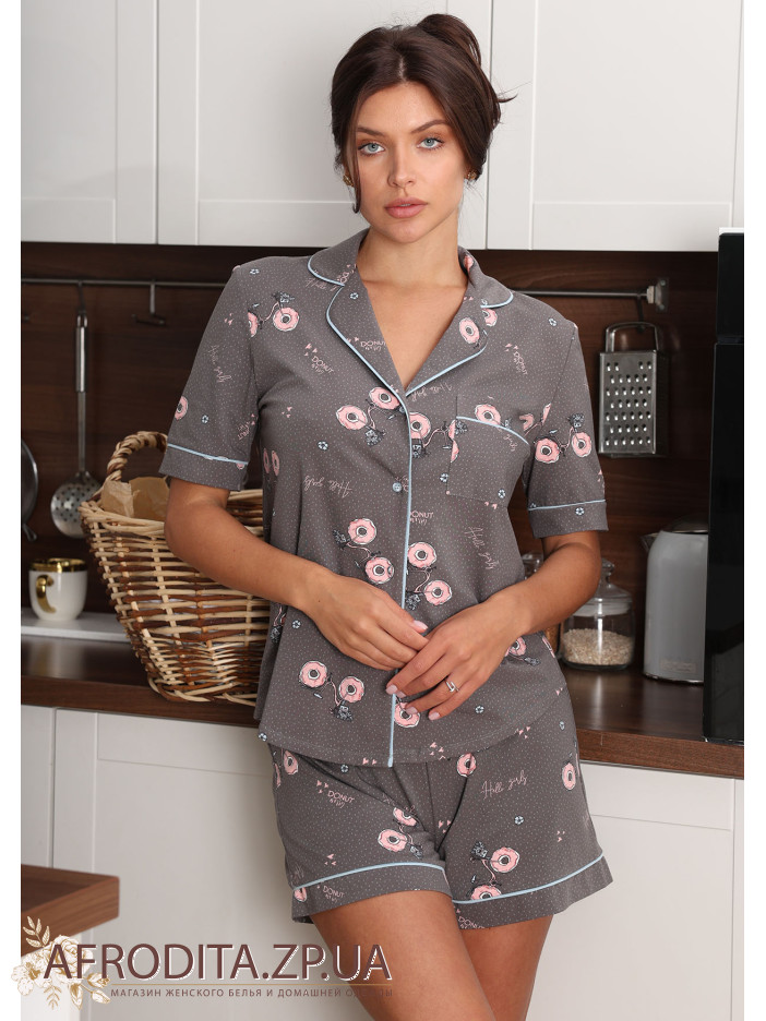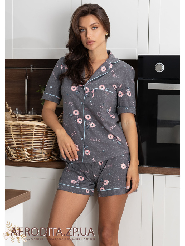 Женская пижама с шортами 1229-16019 изготовленная из мягкого трикотажа. Комплект состоит из рубашки с коротким рукавом и шорт прямого кроя. Окантовка бирюзового цвета придает пижаме неповторимую изюминку.