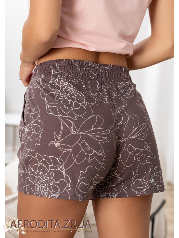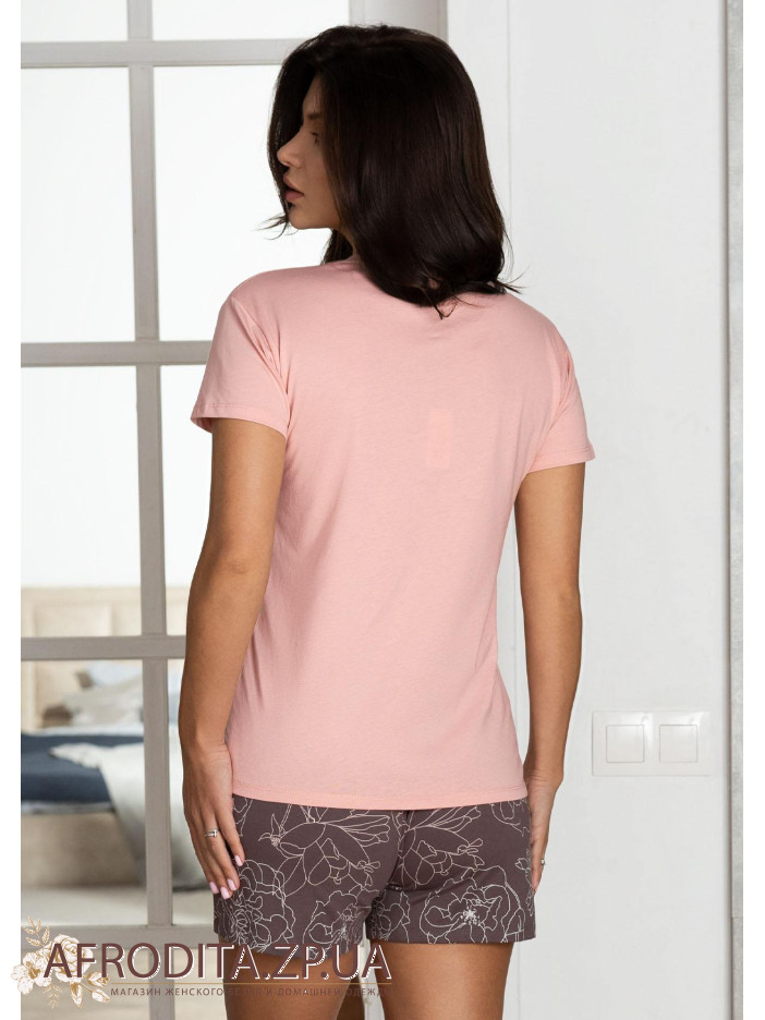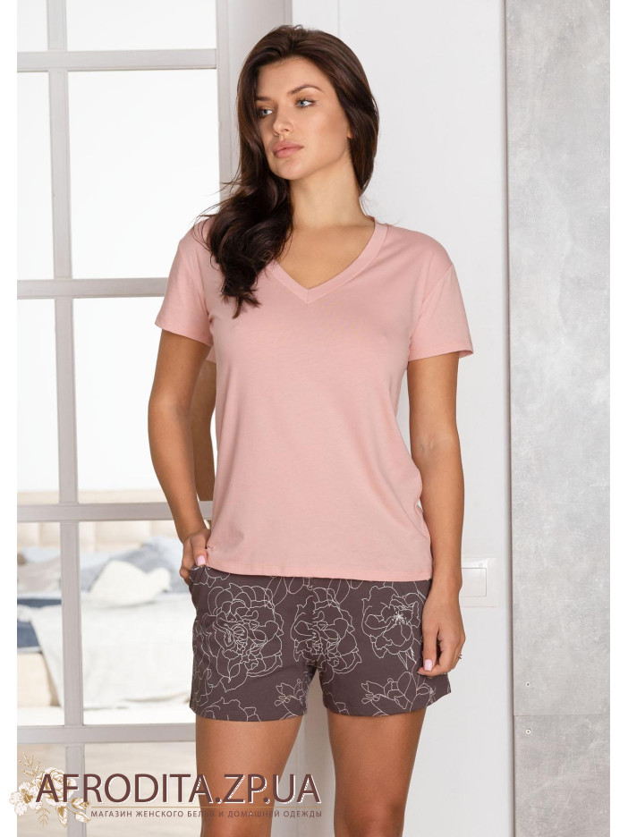 Женская пижама с шортами 1394-12042 изготовленная из хлопковой ткани. Комплект состоит из однотонной футболки с V-образным вырезом и коротких шорт с боковыми карманами.