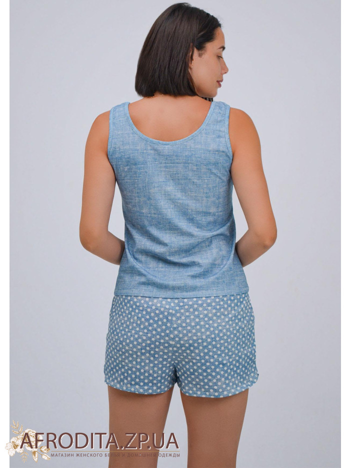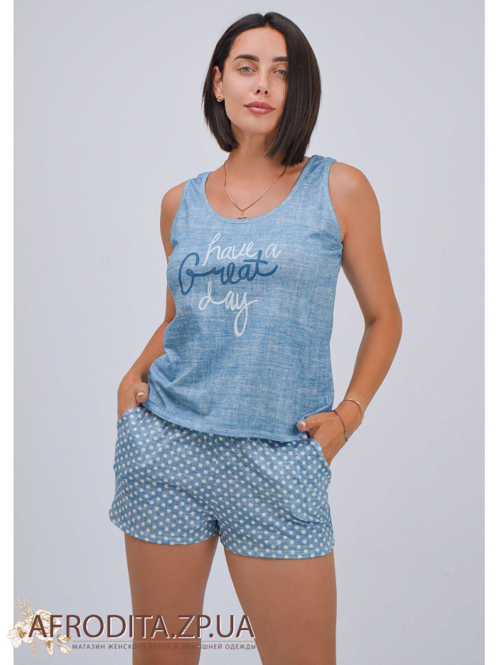 Женская пижама с шортами 708-16601 изготовленная из хлопка. Комплект состоит из коротких шорт голубого цвета в белый горошек, по бокам расположены карманы. Майка на широких бретелях голубого цвета с надписью по центру.