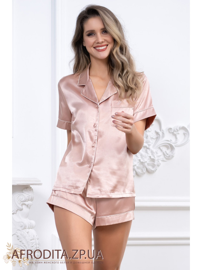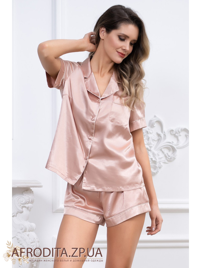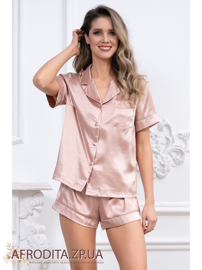Комплект с шортами "Джулия" 8738-2 состоит из рубашки с центральной застежкой на пуговицы с короткими рукавами и шорт. Комплект выполнен из искусственного принтованного шелка. Жакет и шорты оформлены кантом.