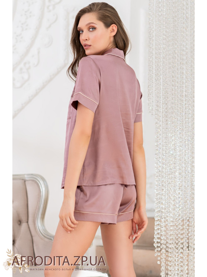 Комплект с шортами "Джулия" 8738-5 состоит из рубашки с центральной застежкой на пуговицы с короткими рукавами и шорт. Комплект выполнен из искусственного принтованного шелка. Жакет и шорты оформлены кантом.