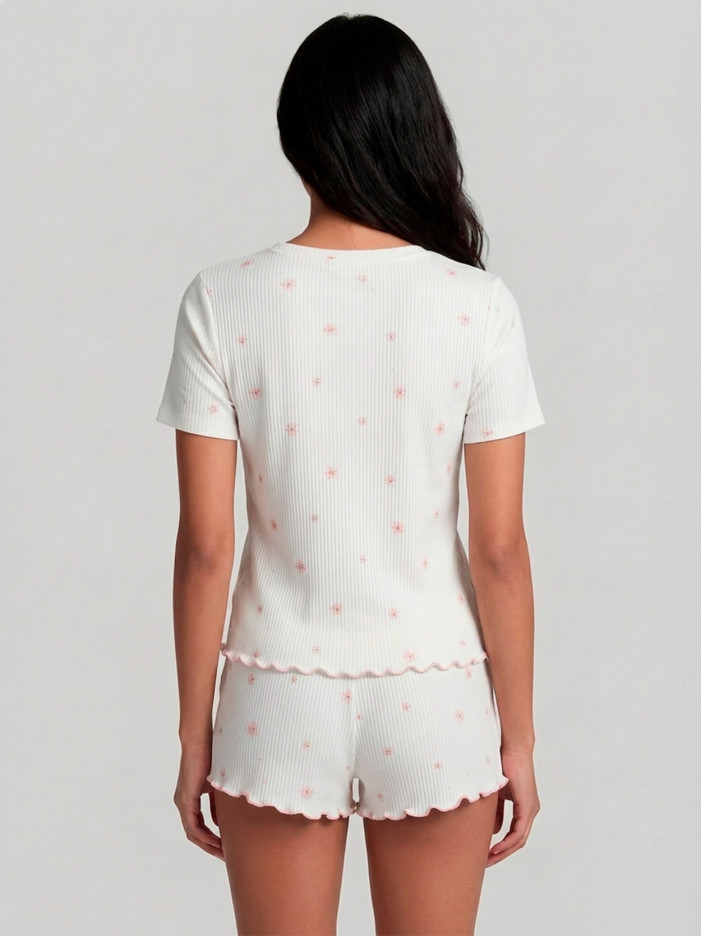 Женская пижама — идеальный выбор для тех, кто ценит комфорт, лёгкость и естественную простоту, выполнена из мягкой рибаны на основе натурального хлопка, которая приятно прилегает к телу, не сковывает движения и позволяет полностью расслабиться, дышащая ткань подходит для ежедневного ношения и дарит ощущение уюта в любое время, белый цвет выглядит свежо и аккуратно, а деликатный цветочный принт добавляет мягкости и спокойного настроения, футболка с коротким рукавом имеет свободный крой для максимального удобства, шорты с эластичным поясом комфортно садятся по фигуре, не создавая давления, аккуратные волнистые края придают образу лёгкий декоративный акцент, делая комплект более интересным и завершённым, отличный вариант для сна и домашнего отдыха, который легко станет базовой частью гардероба и будет радовать каждый день