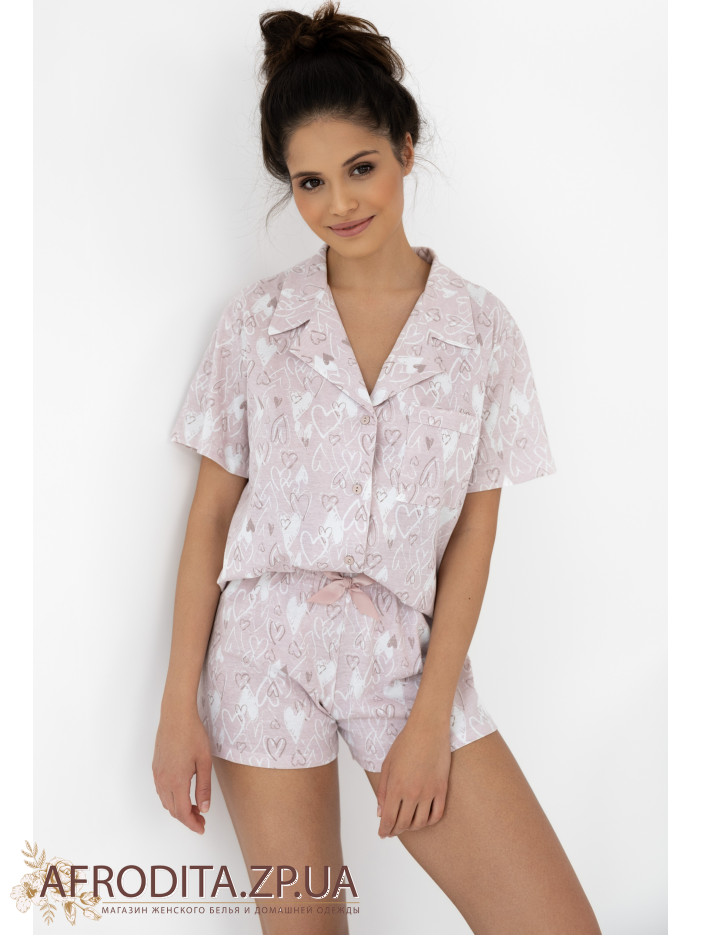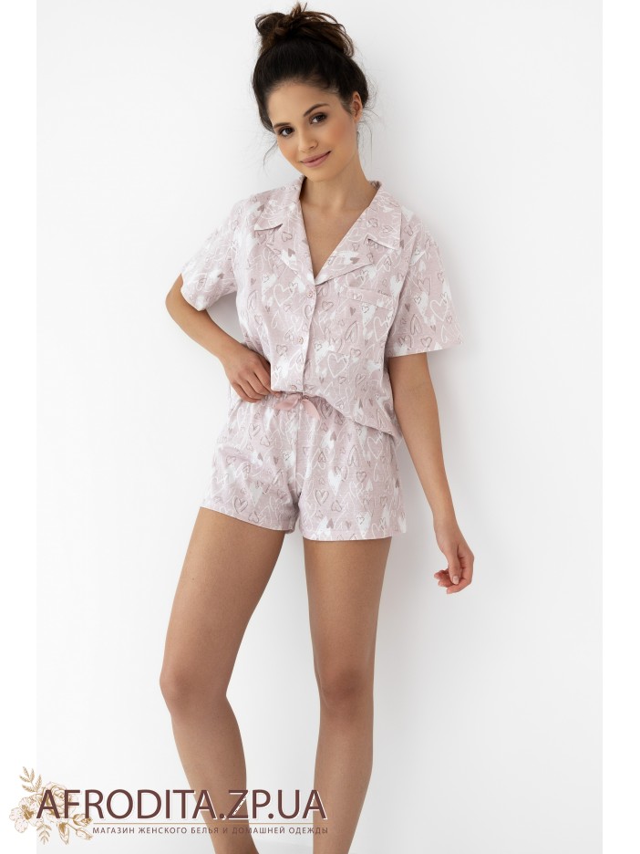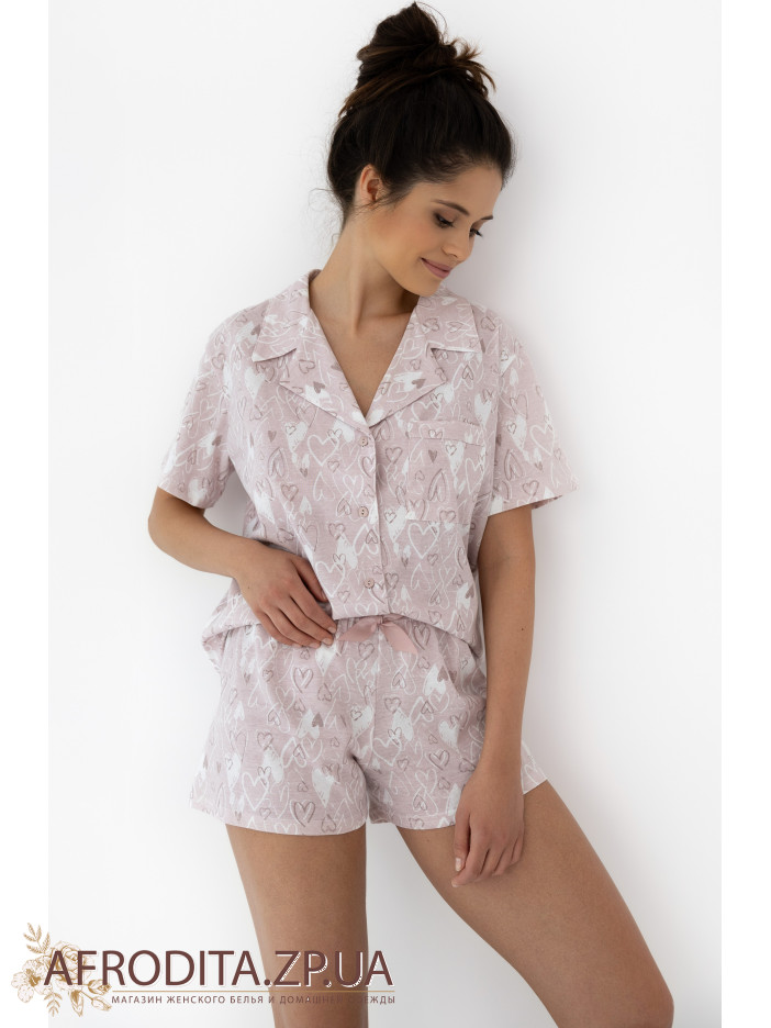 Женская пижама с шортами с оригинальным принтов в виде сердечек от польского бренда Sensis изготовленная из высококачественного трикотажного полотна на основе хлопка. Комплект состоит из рубашки на пуговицах с короткими рукавами, на груди расположен накладной карман. Шорты короткие на резинке, в области пояса в качестве декора расположен атласный бантик. Пижама очень практичная и удобная, ткань очень приятная к телу. Данная модель может быть отличным подарком вашему близкому человеку.