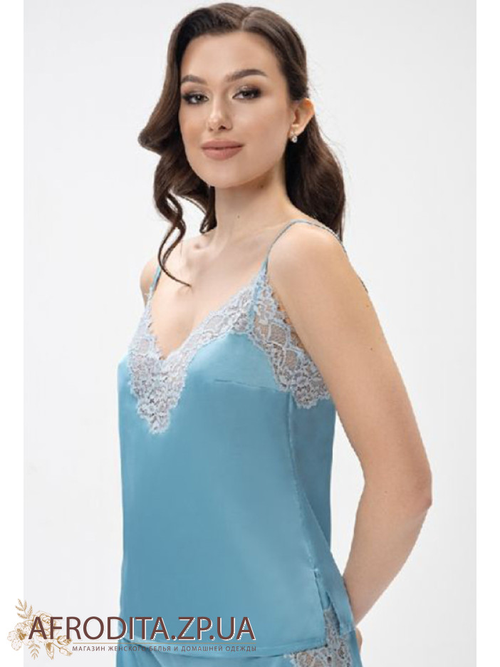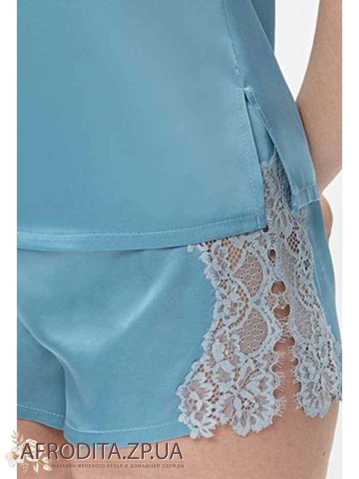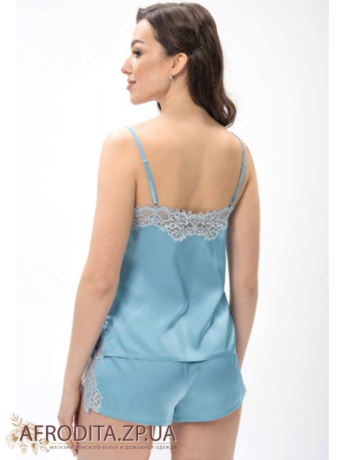 Женская пижама с шортами Shato 2408 из атласного шелка. Комплект состоит из майки на тонких бретелях, которые регулируются. Область декольте и спинка украшены кружевом. Шорты на резинке с боковыми разрезами, декорированные кружевом.