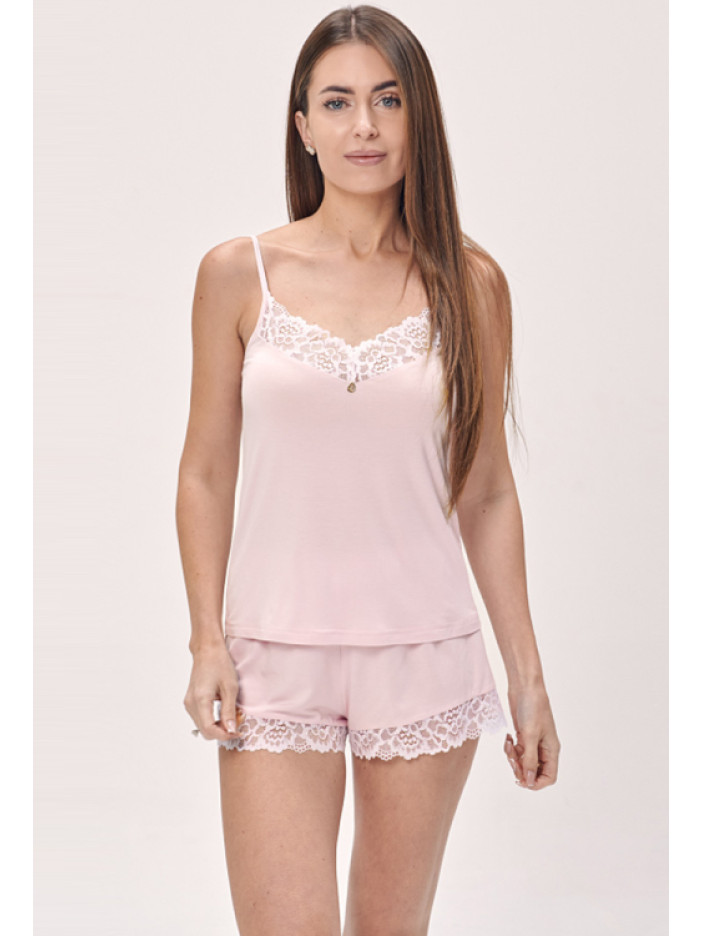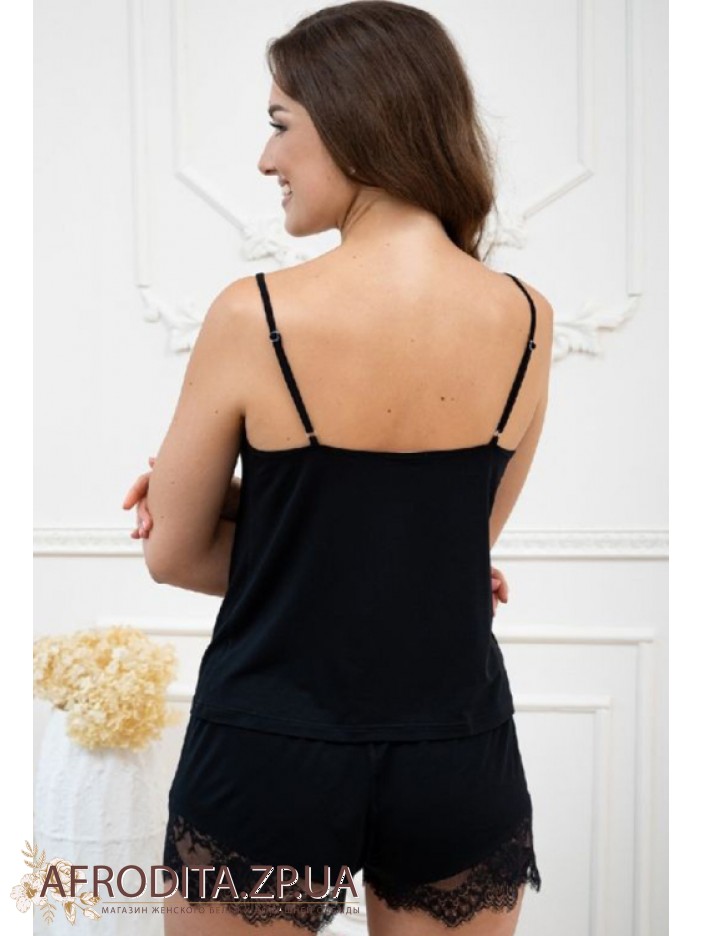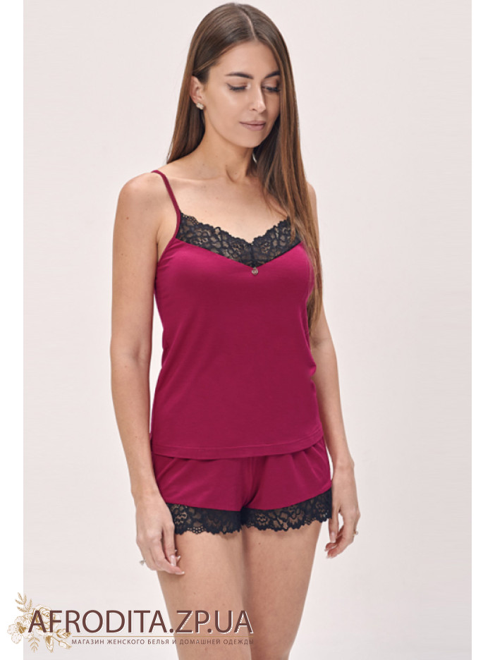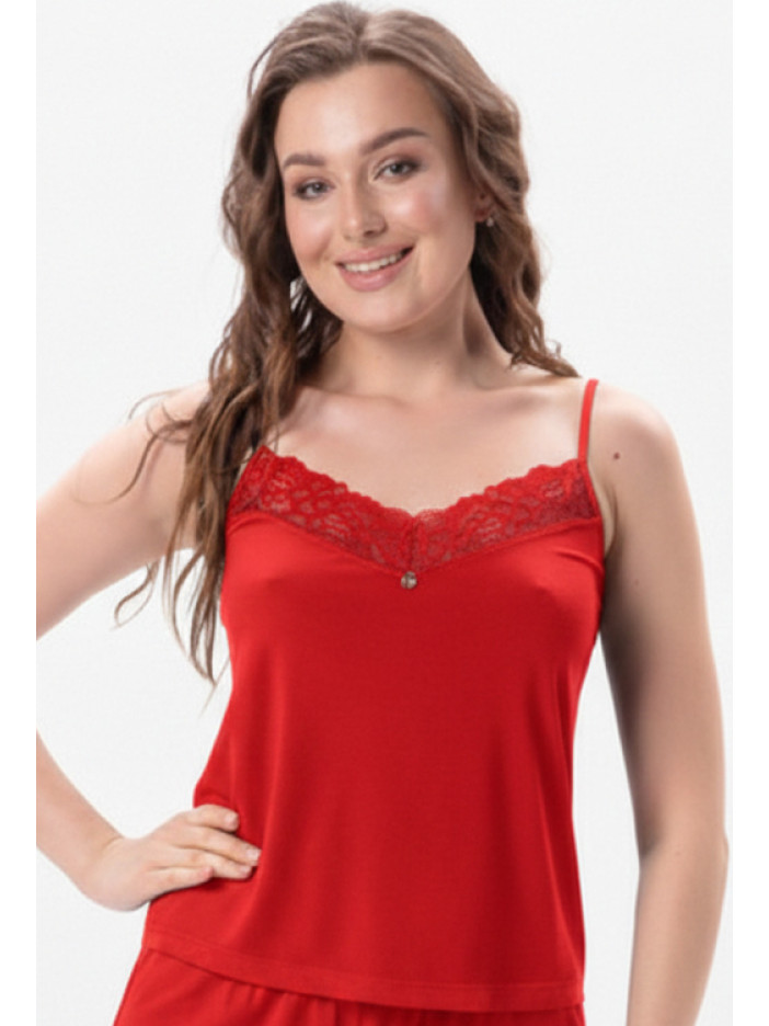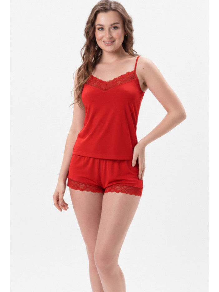 Женская пижама с шортами Shato 2437 в красном цвете изготовленная из мягкой вискозы. В комплект входит майка черного цвета на тонких регулируемых бретелях, область декольте украшена кружевом и маленькой подвеской, шорты на резинке, края также декорированы кружевом.