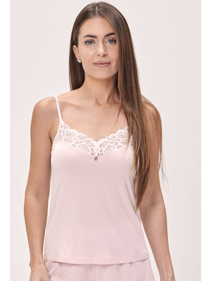 Женская пижама с шортами Shato 2437 в цвете пудра изготовленная из мягкой вискозы. В комплект входит майка черного цвета на тонких регулируемых бретелях, область декольте украшена кружевом и маленькой подвеской, шорты на резинке, края также декорированы кружевом.