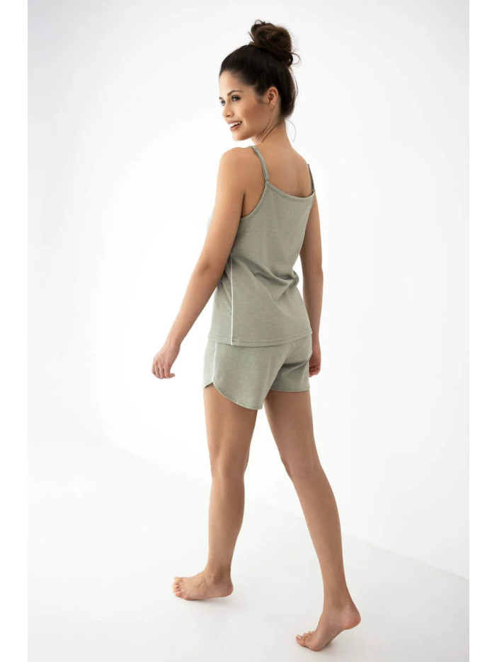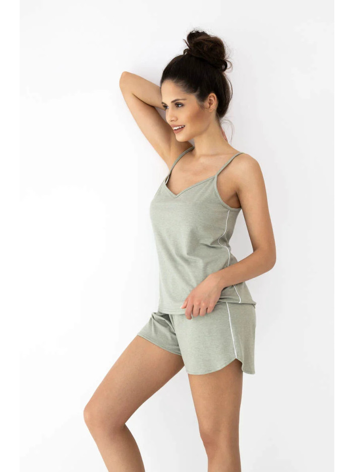 Женский пижамный комплект Sensis в нежном шалфейно-зелёном оттенке — это лёгкость, комфорт и современный минимализм в одном образе: топ на тонких бретелях с элегантным V-образным вырезом подчёркивает женственность, а шорты с мягким эластичным поясом обеспечивают идеальную посадку без давления, приятный к телу трикотаж с хлопком хорошо пропускает воздух, мягко тянется и сохраняет форму даже после частых стирок, делая комплект отличным выбором для сна, домашнего отдыха, тёплых помещений и удобным вариантом для путешествий