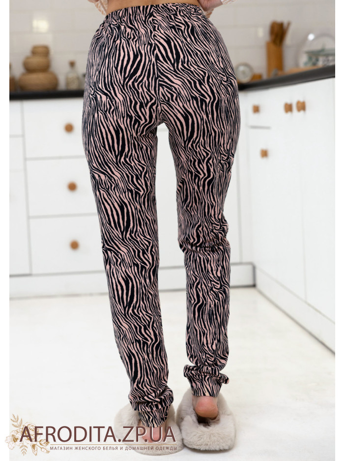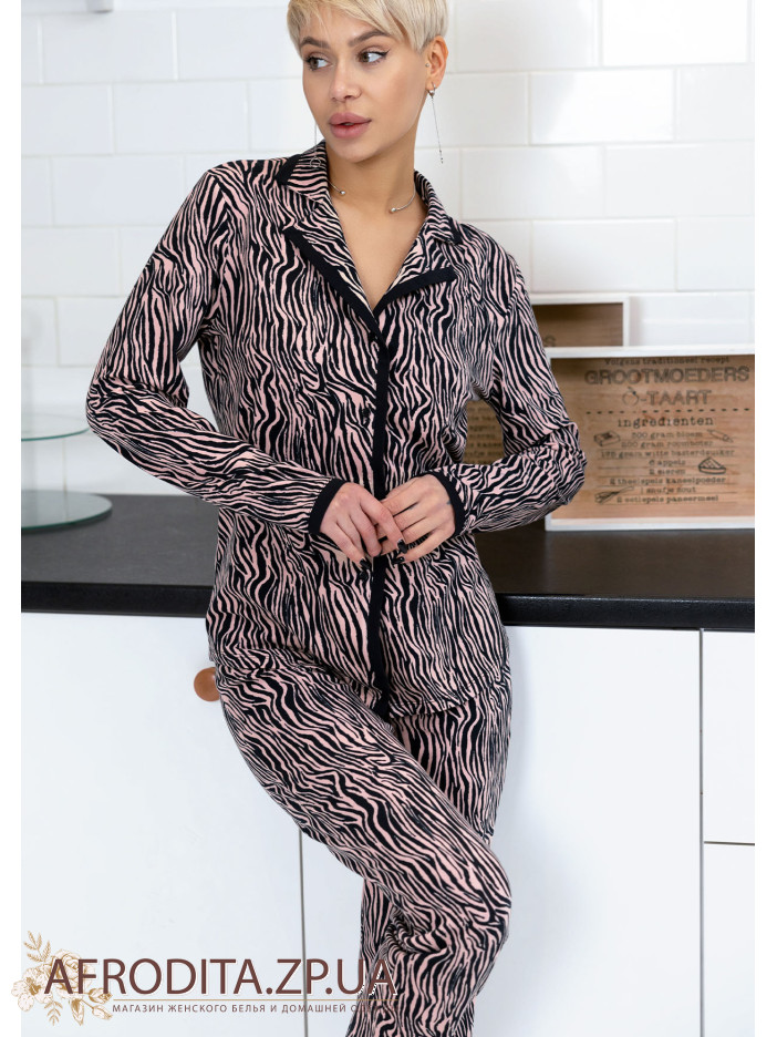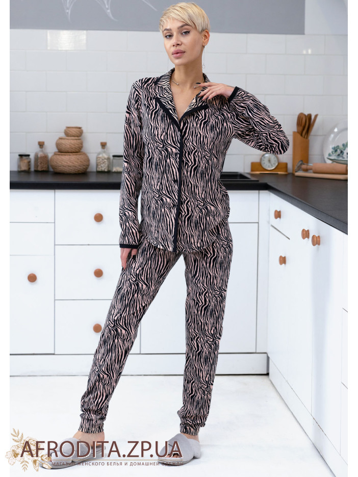 Женская пижама со штанами 1595-16125 из трикотажного полотна с анималистическим принтом. Комплект состоит из джемпера, который застегивается на пуговицы и штанов прямого кроя на резинке. Борт джемпера и манжеты рукавов декорированы черным кантом.