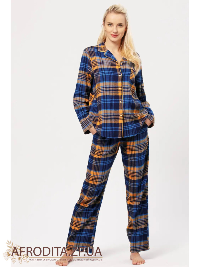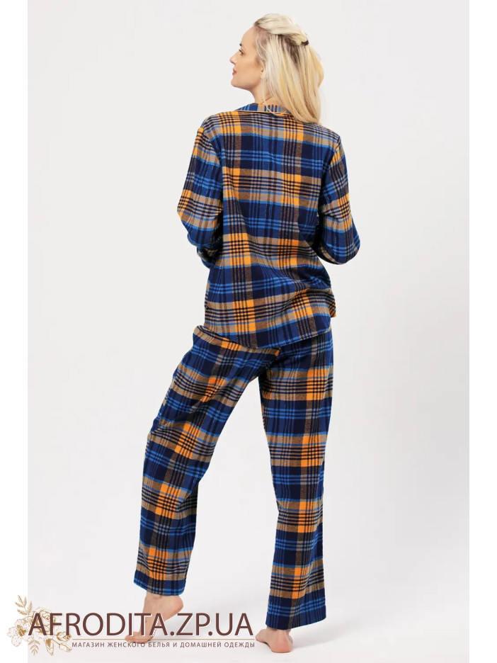 Женская пижама со штанами Key 82761 из мягкой фланели. В комплект входит рубашка с длинным рукавом на пуговицах и штанов на резинке прямого кроя, в боковых швах расположены карманы.