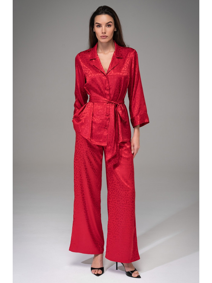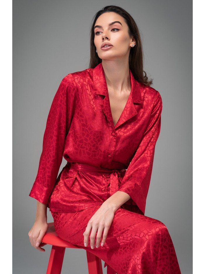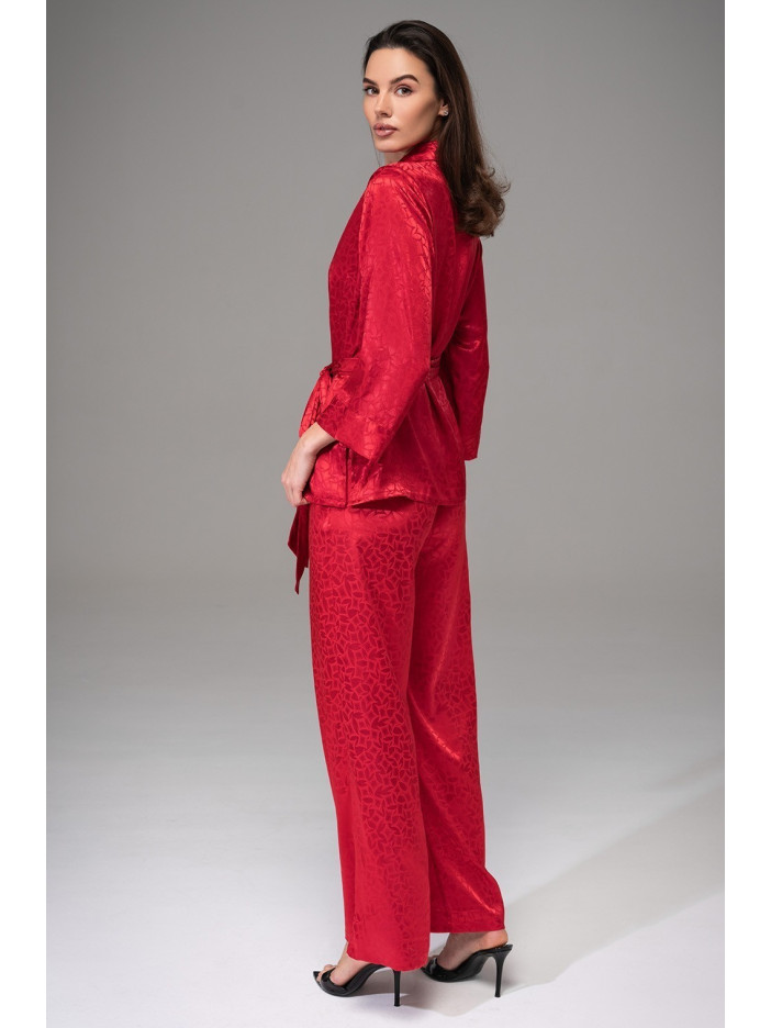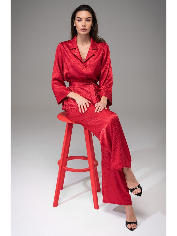 Элегантный женский домашний комплект Джоанна 7314-2 от Mia-Amore состоит из жакета с свободного кроя с длинным рукавом, который застегивается на пуговицы. Брюки свободные на резинке в области талии, крой свободный. Данная пижама выполнен из однотонного искусственного шелка красного цвета на жаккардовой основе. В боковых швах брюк расположены карманы. Линию талии можно подчеркнуть за счет пояса, который идет в комплекте. Пижама выглядит очень роскошно, ткань очень приятная к телу.