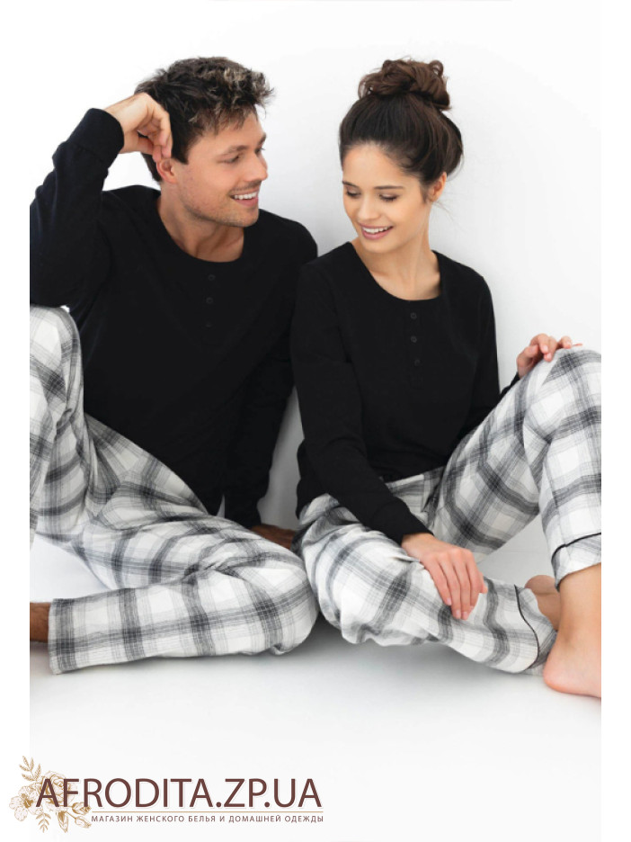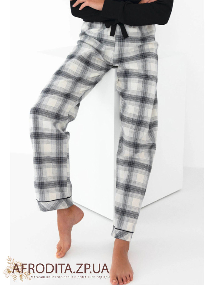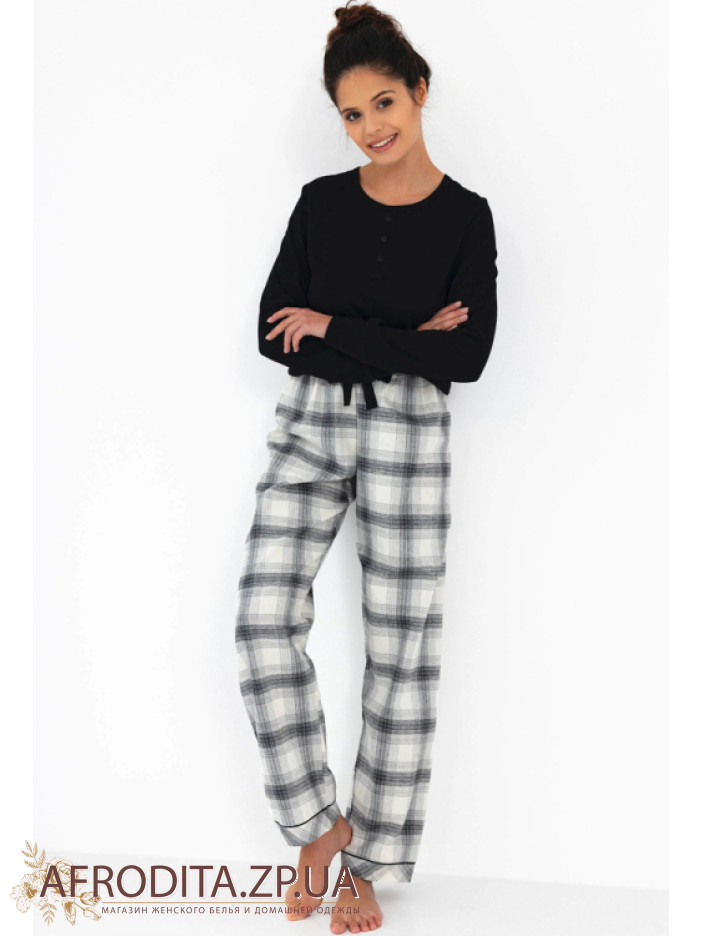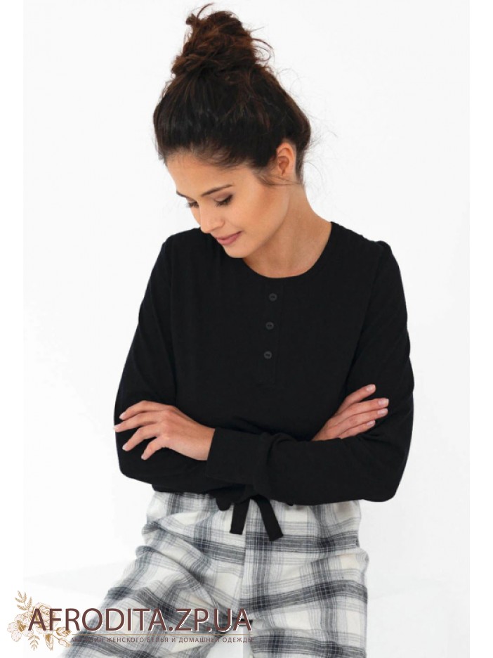 Женская пижама со штанами Sensis из высококачественного хлопка. В комплект входит кофта черного цвета с длинными рукавами и штанов на резинке свободного кроя в шотландскую клетку.