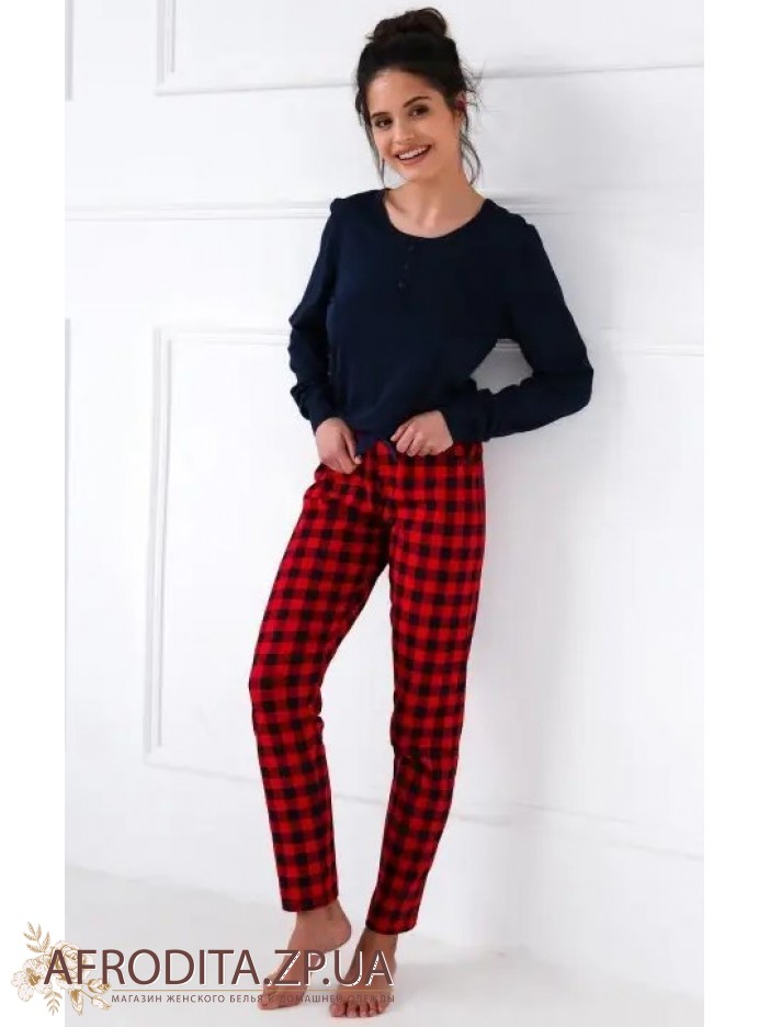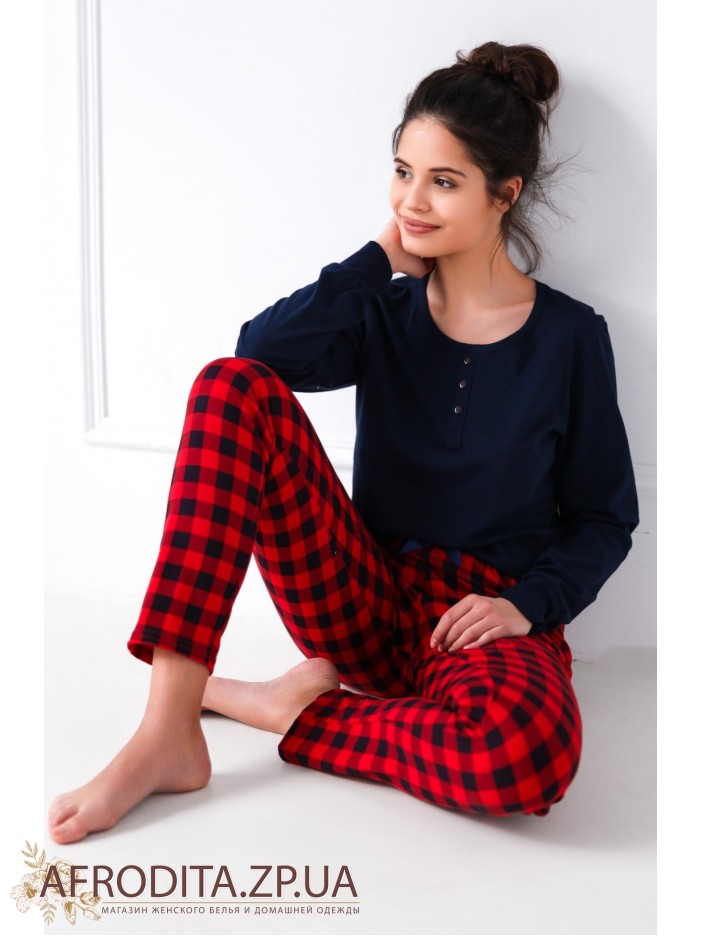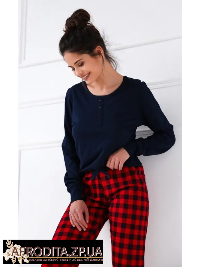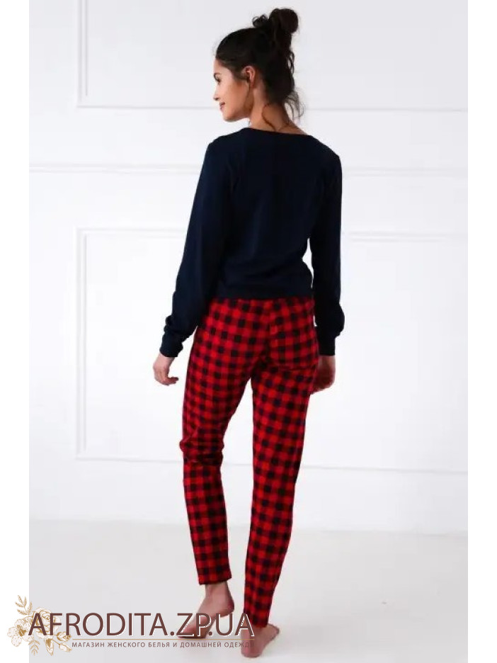 Женская пижама со штанами Sensis из высококачественной хлопковой ткани. В комплект входит джемпер темно-синего цвета с длинными рукавами и штанов на резинке прямого кроя в шотландскую клетку.