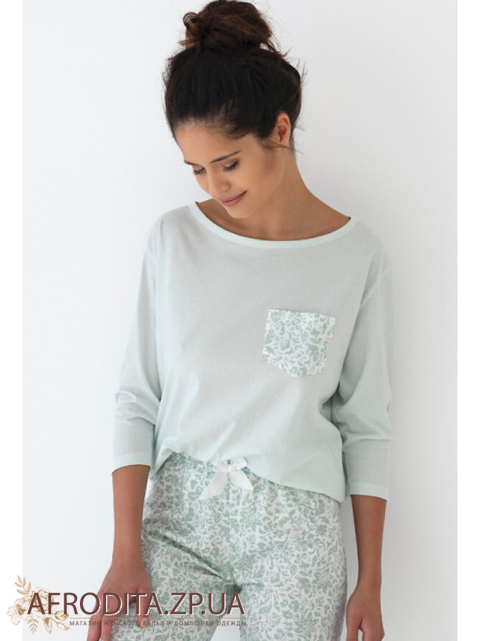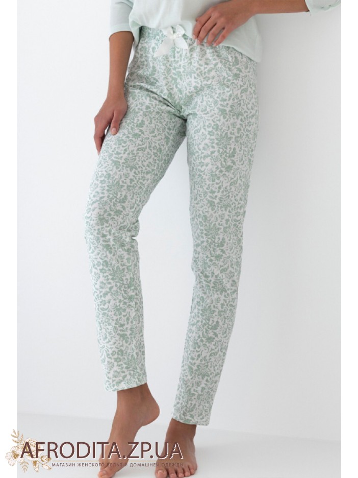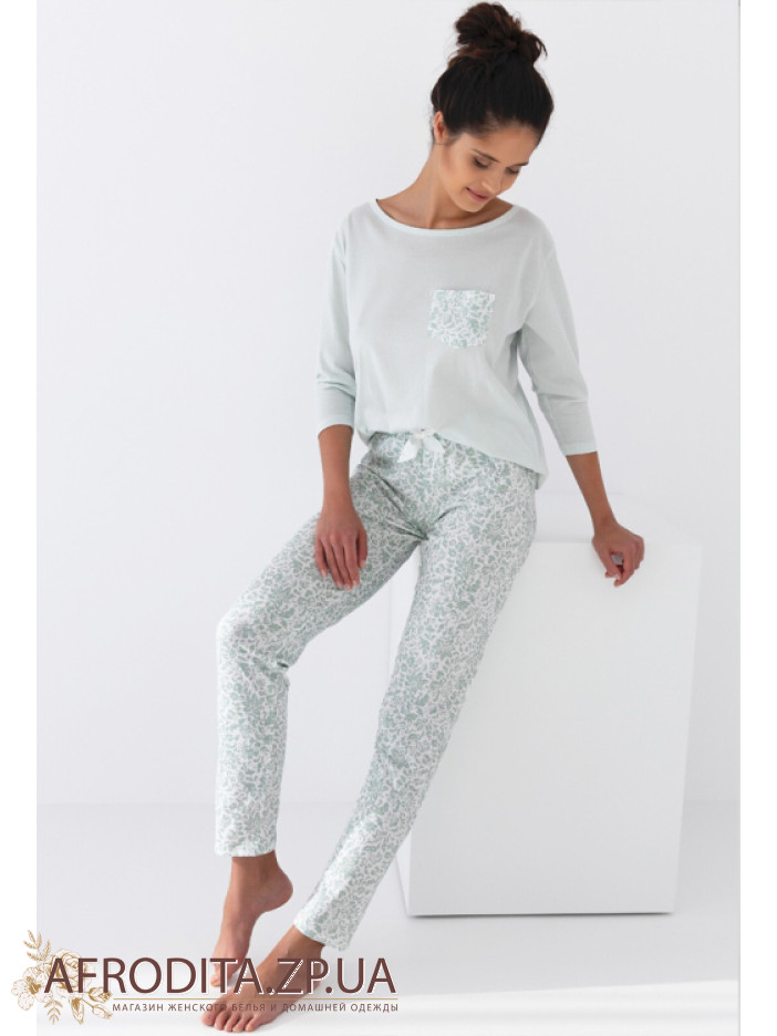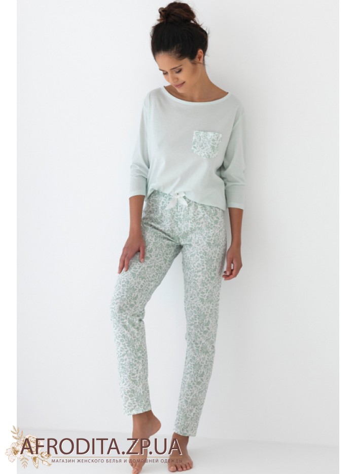 Женская пижама со штанами Sensis Flora изготовленная из трикотажного полотна на основе хлопка. В комплект входит джемпер с широкой горловиной и рукавом 3/4, спереди расположен накладной декоративный карман. Штаны на резинке и немного заужены к низу, но поясе расположен бантик.