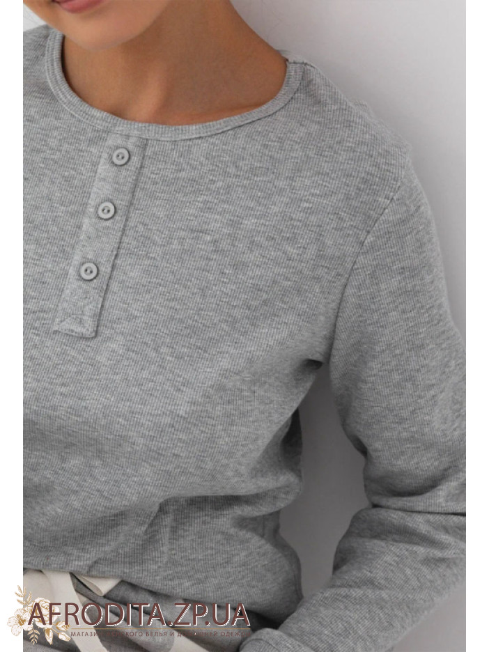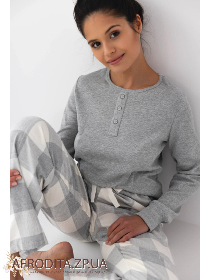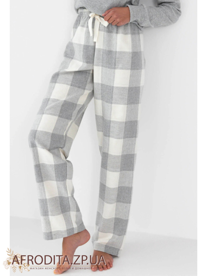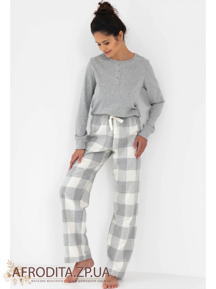Женская пижама со штанами Sensis Vesper из трикотажной ткани. Комплект состоит из однотонной кофты в рубчик серого цвета с длинными рукавами. Вырез горловины имеет округлую форму. Штаны на резинке прямого кроя в шотландскую клетку, линию талии можно регулировать с помощью завязок.