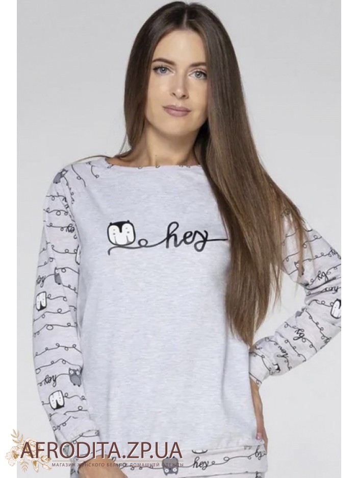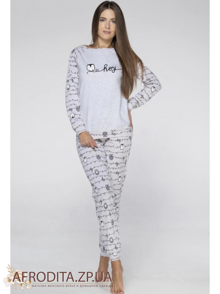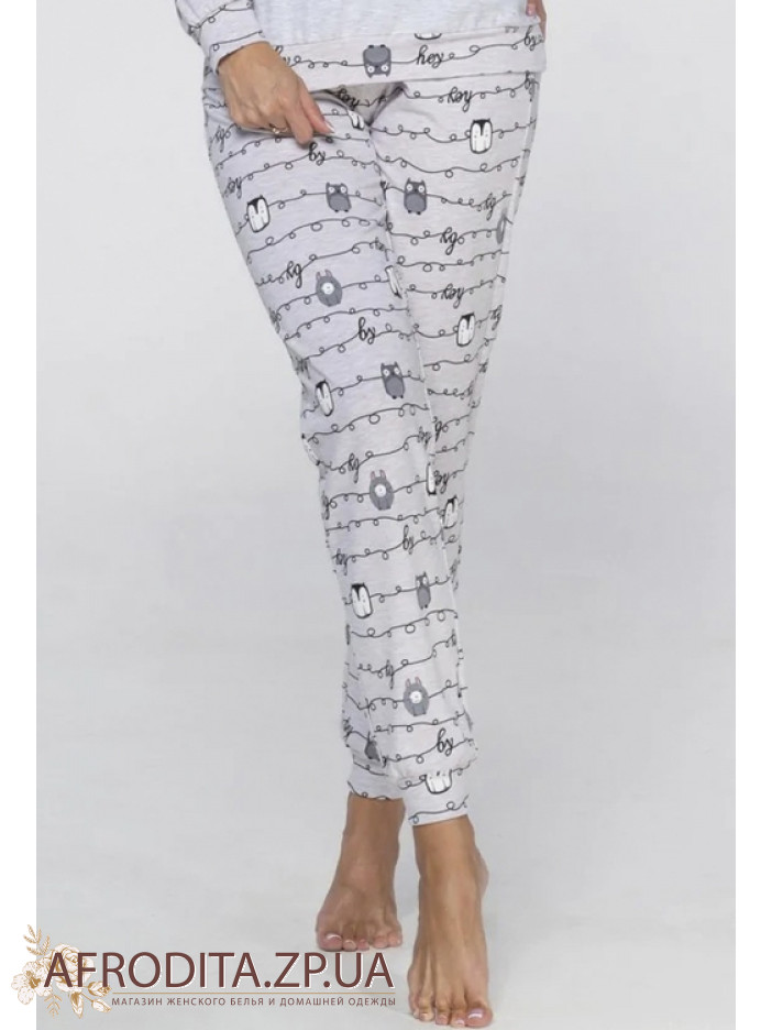 Женская пижама со штанами Wiktoria 1324 из мягкого и очень приятного к телу хлопка. В комплект входит джемпер серого цвета с длинными рукавами и округлым вырезом горловины и штанов прямого кроя на резинке.