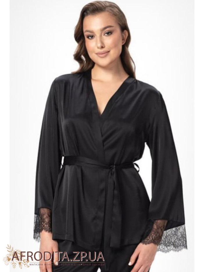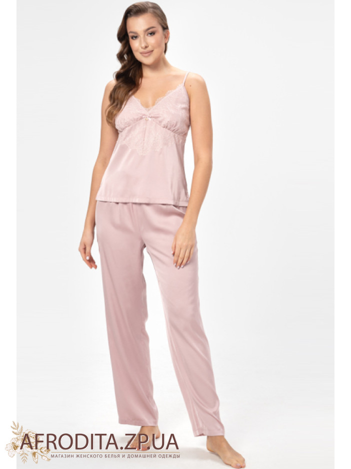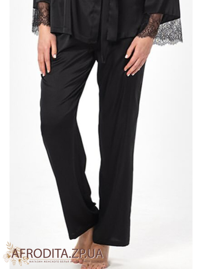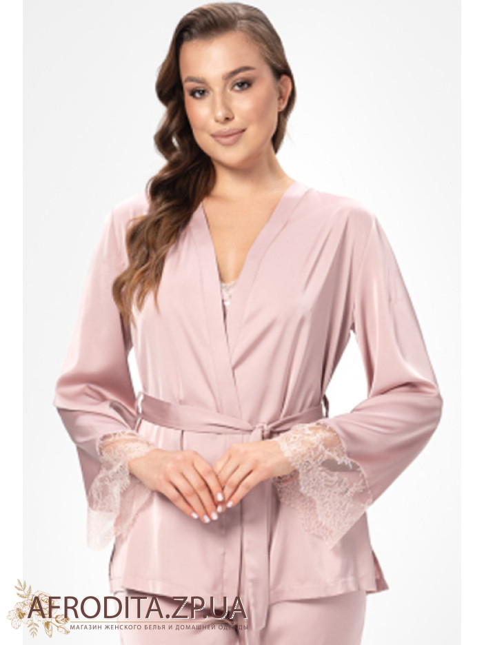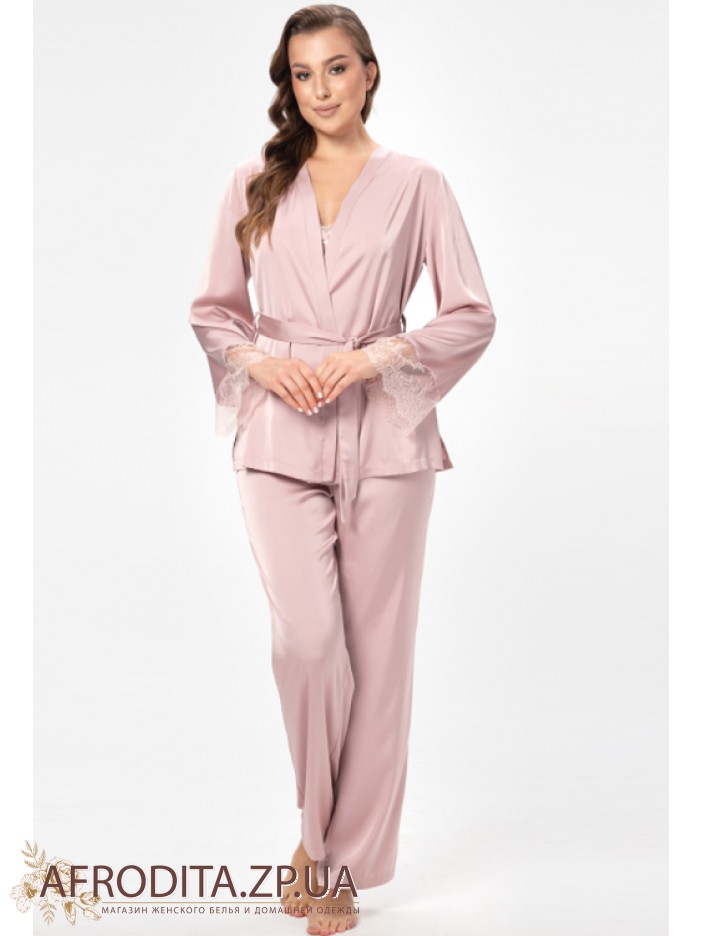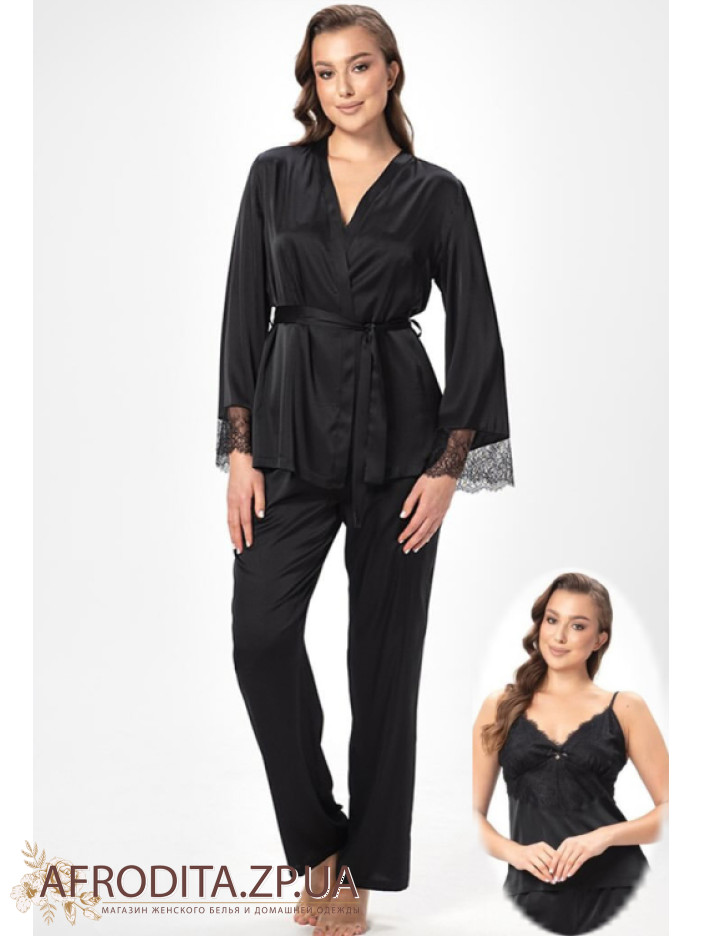 Женская пижама-тройка Shato 2504 изготовленная их мягкого и очень приятного к телу атласного шелка. В комплект входит жакет на запах с длинными рукавами, края декорированы ажурным кружевом. Майка на тонких регулируемых бретелях, область декольте украшена кружевом и кокетливыми атласным бантиком. Штаны на резинке прямого силуэта.